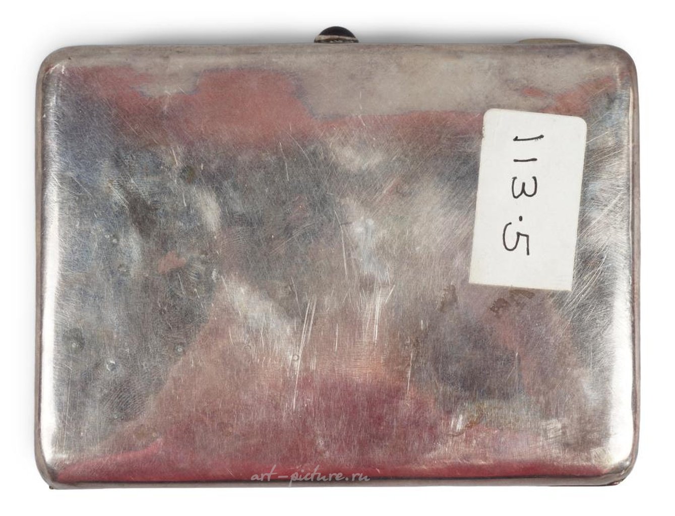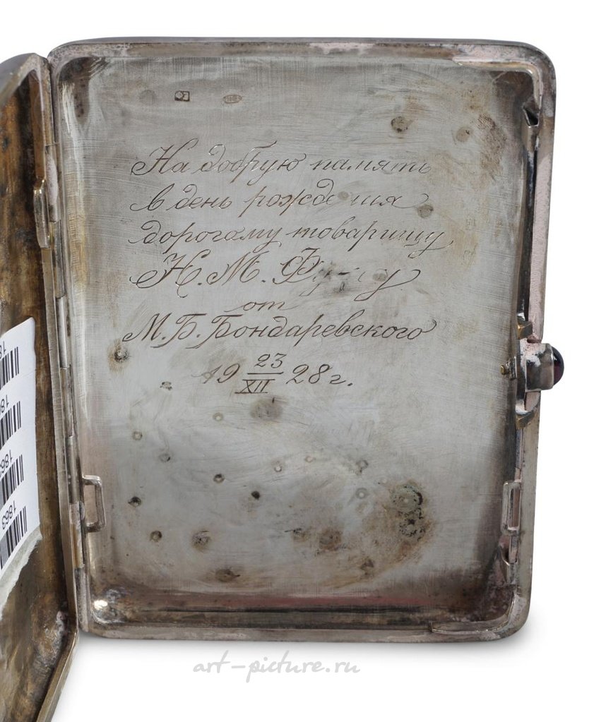 РУССКИЙ СЕРЕБРЯНЫЙ СИГАРЕТНЫЙ КОШЕЛЕК с неразобранными марками в нижней части коробки. Прямоугольная коробка украшена рельефной традиционной сценой охотника и волка в лесу. Внутри коробки - позолоченное покрытие и посвятительная надпись на одной стороне. Кошелек также имеет овальную красную кабошонную камень-пуговицу.