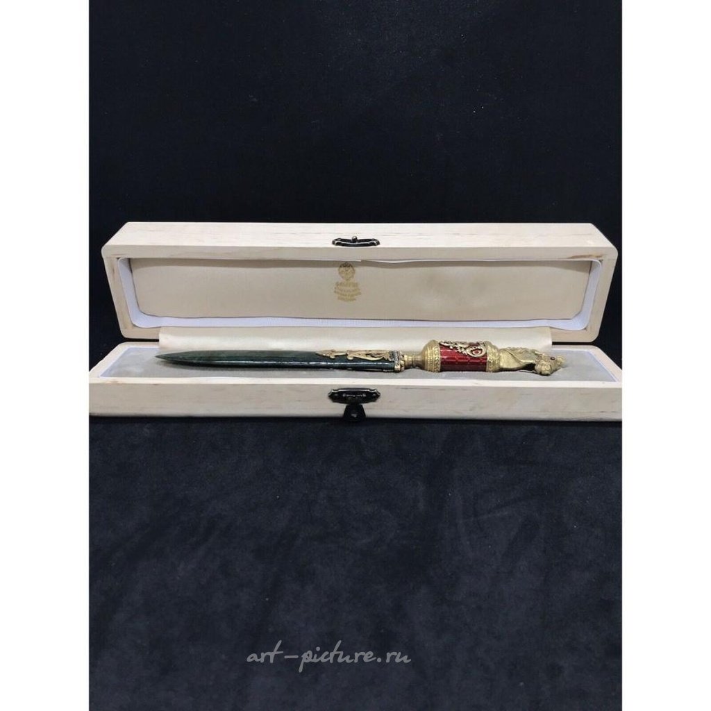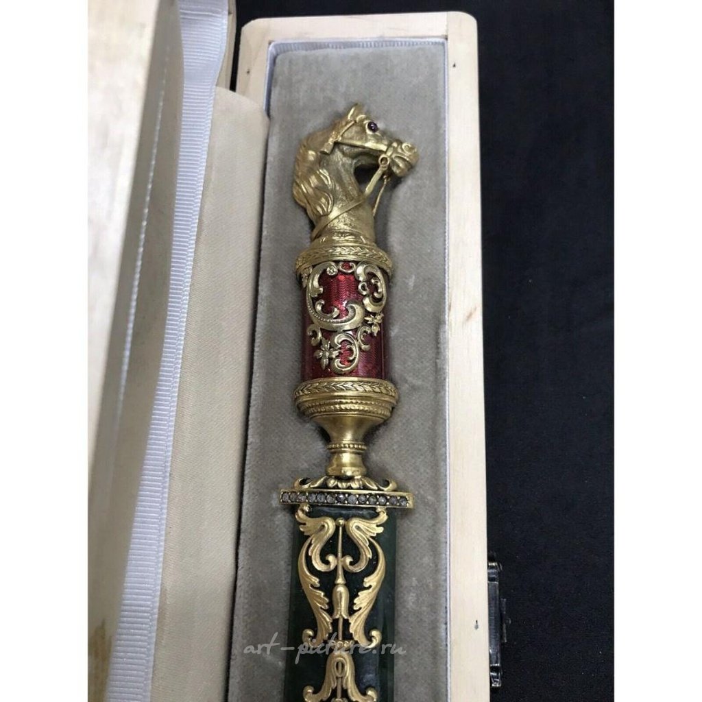 Русская эмалированная серебряная открывалка для писем с нефритовым жадеитовым конем и бриллиантами в коробке (22 см).
