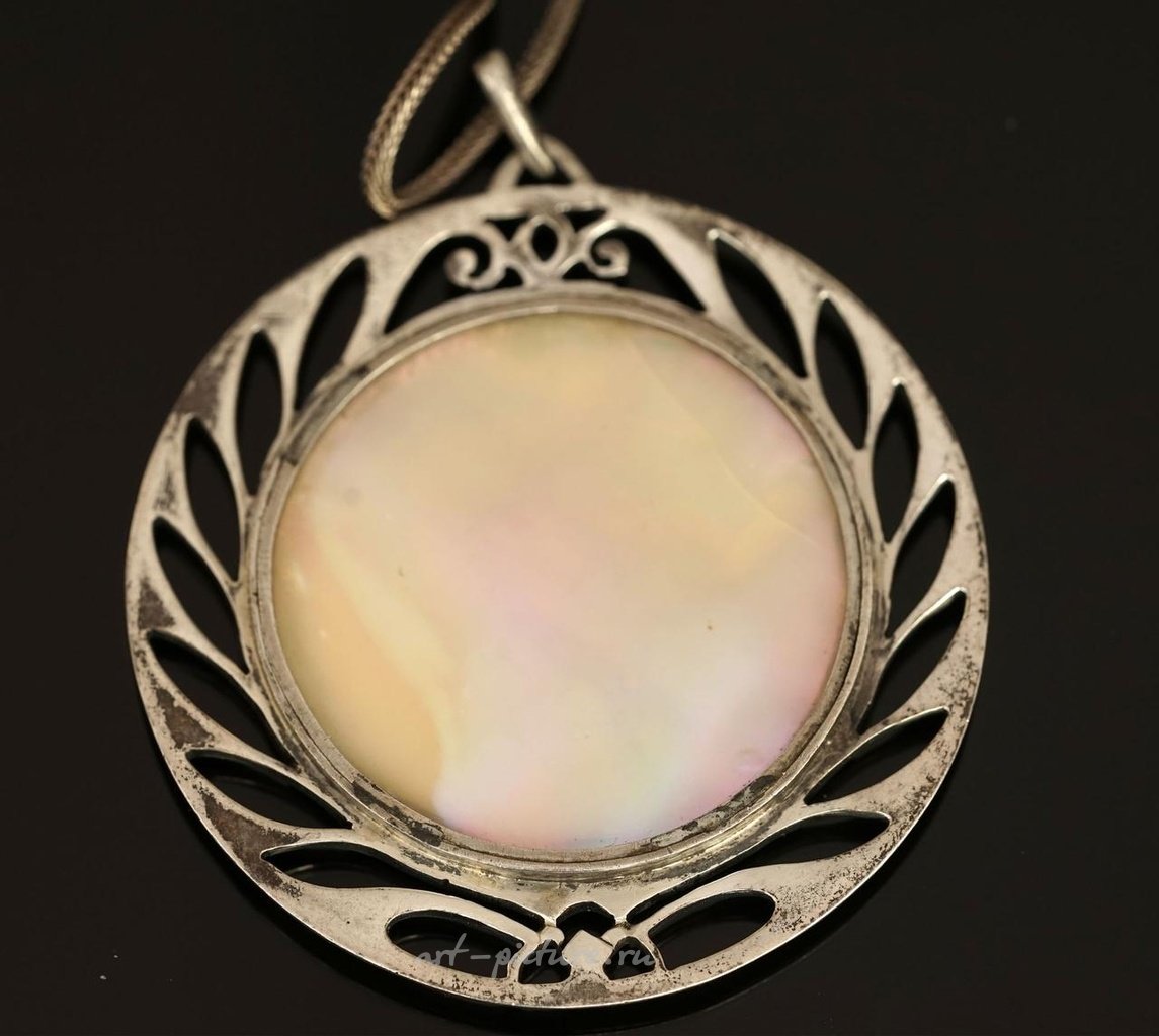 Медальон из серебра минимум 800 проба, с открытым рисунком в центре на мать-перле, изображающим молодую женщину в традиционной русской головной уборе. Подпись внизу слева (волосок на мать-перле на обратной стороне). Диаметр: 5 см. Вес: 14,8 г.