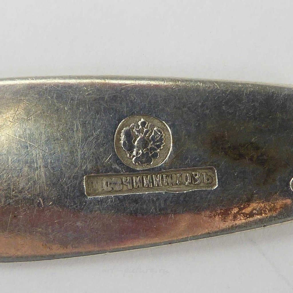 Десять предметов серебряного столового прибора 19-го века, включая пять кофейных ложек, две маленькие десертные ложки, десертную ложку и два фруктовых ножа. Самый большой предмет имеет длину 21 см, а чайная ложка - 15 см. Каждый предмет имеет русскую пробу 84 (серебро 840/1000) и, возможно, марку спонсора, принадлежащую Павлу Акимову Овчинникову, примерно 1870 года. Общий вес предметов составляет