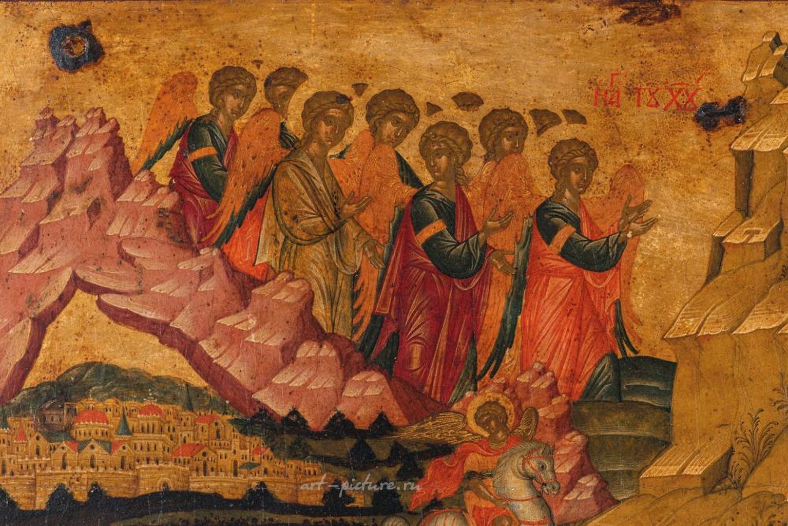 Темпера на деревянной панели; реставрации и потери см 62x102 ВЕНЕЦИАНО-КРИТСКАЯ ИКОНА ПОКЛОНЕНИЯ ВОЛХВОВ И ТВОРЕНИЯ, XVII ВЕК, Т. ПОУЛАКИС (ПРИПИС.); РЕСТАВРАЦИИ И ПОТЕРИ