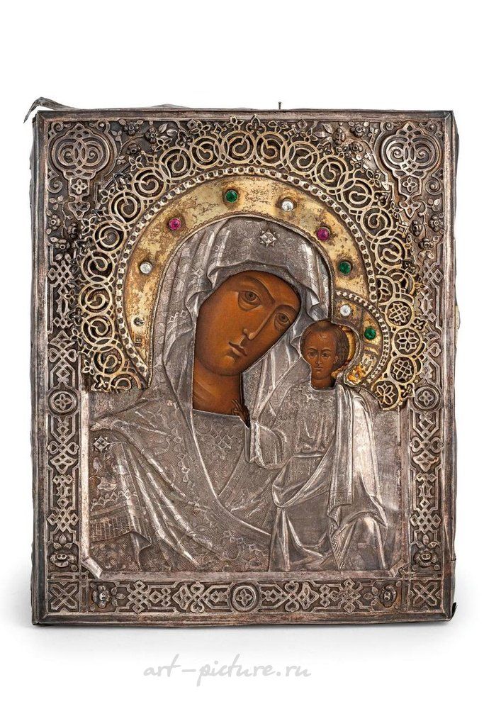 на деревянной панели; реставрации и потери размером 36x30 см. Русская икона Богоматери Казанской с серебряно-золотым и стеклянным окладом, Санкт-Петербург, 1876 год; реставрации и потери.