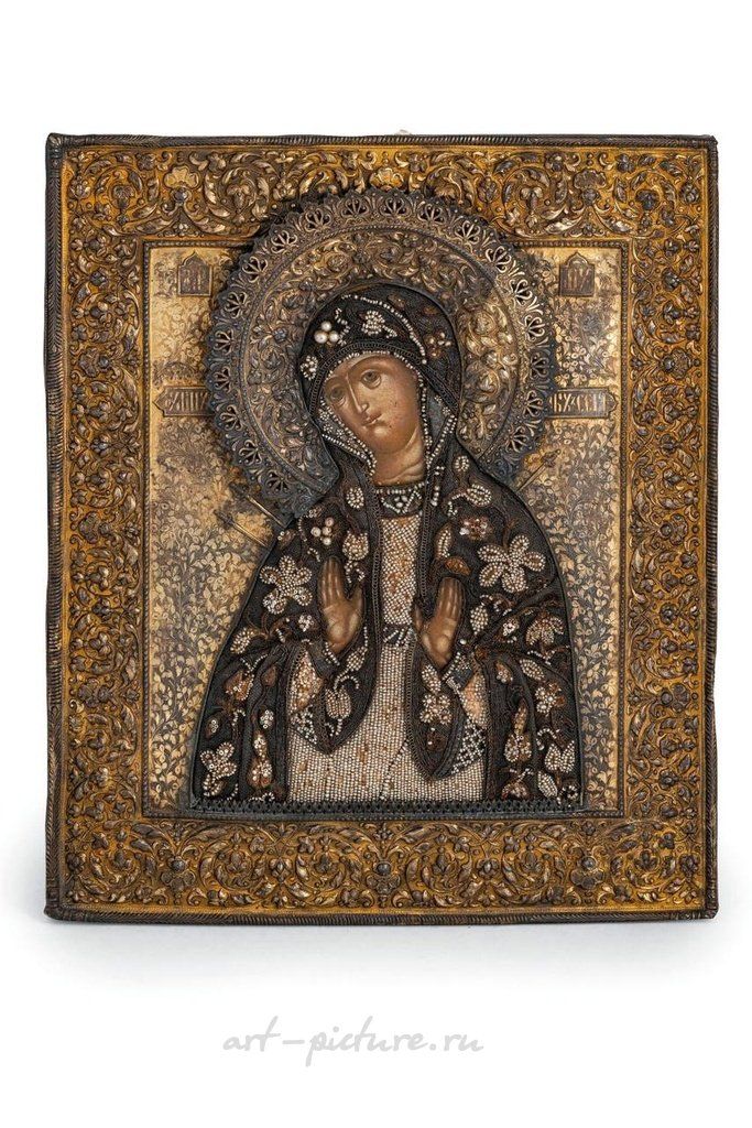 Темпера на деревянной панели; восстановления и потери размером 36x31 см. Русская икона Богоматери Семи Мечей с серебряно-золоченым, филигранью и жемчужным окладом из стекла, Москва, 1885 год; восстановления и потери.