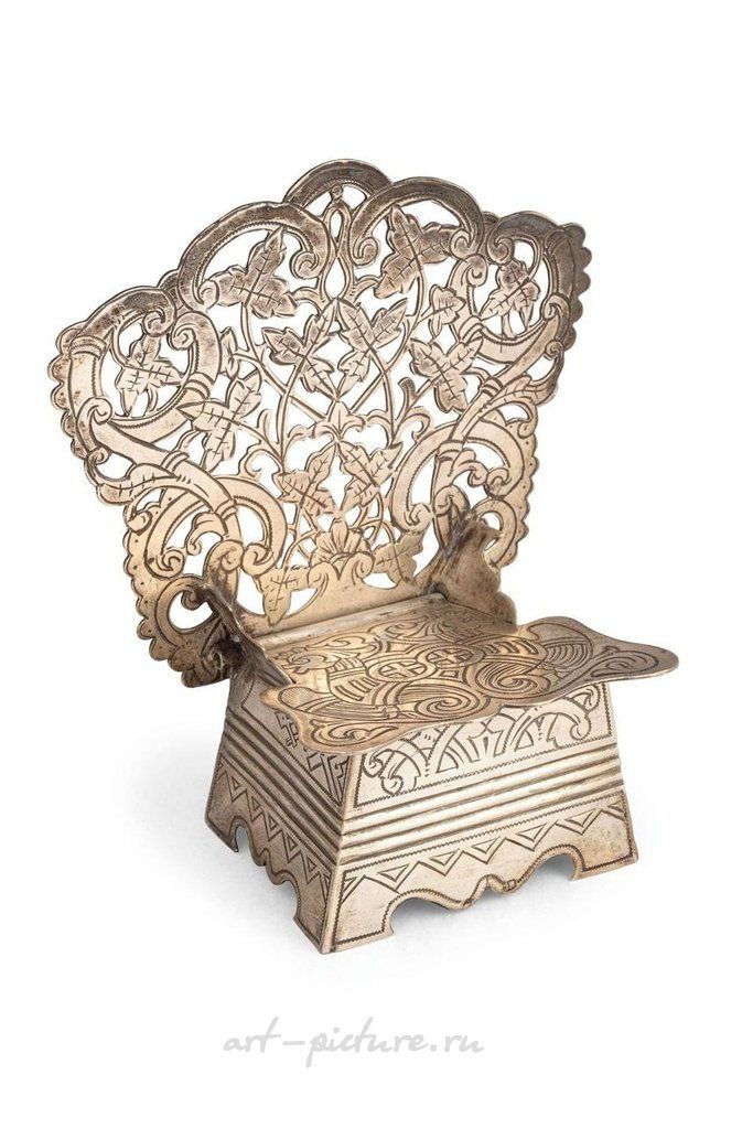 Серебряный троновый солонка русского происхождения, Москва, 1899-1908 годы, марки М. Голоскапова. Имеет больше ножек, тела и сиденья, украшенных натуралистическими и геометрическими мотивами, перфорированную спинку; имеются дефекты. Высота 11,6 см, ширина 10,6 см; вес 126 граммов.