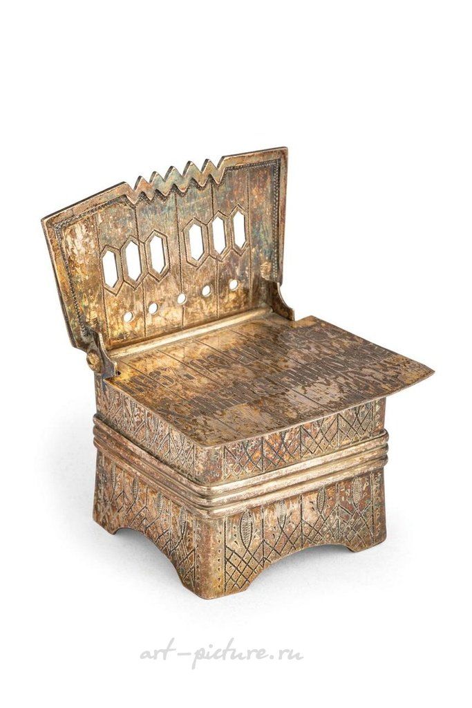 На четырех ножках, вся поверхность украшена тромп-л'оэй. На нижней стороне сиденья есть выгравированная курица, символизирующая плодородие. Спинка имеет маленькие окна. Дефекты: высота 7,9 см, ширина 6,2 см; вес 100 грамм. Русская серебряная солонка-трон, Москва, 1869 год, маркировка Г. Иванова; дефекты.
