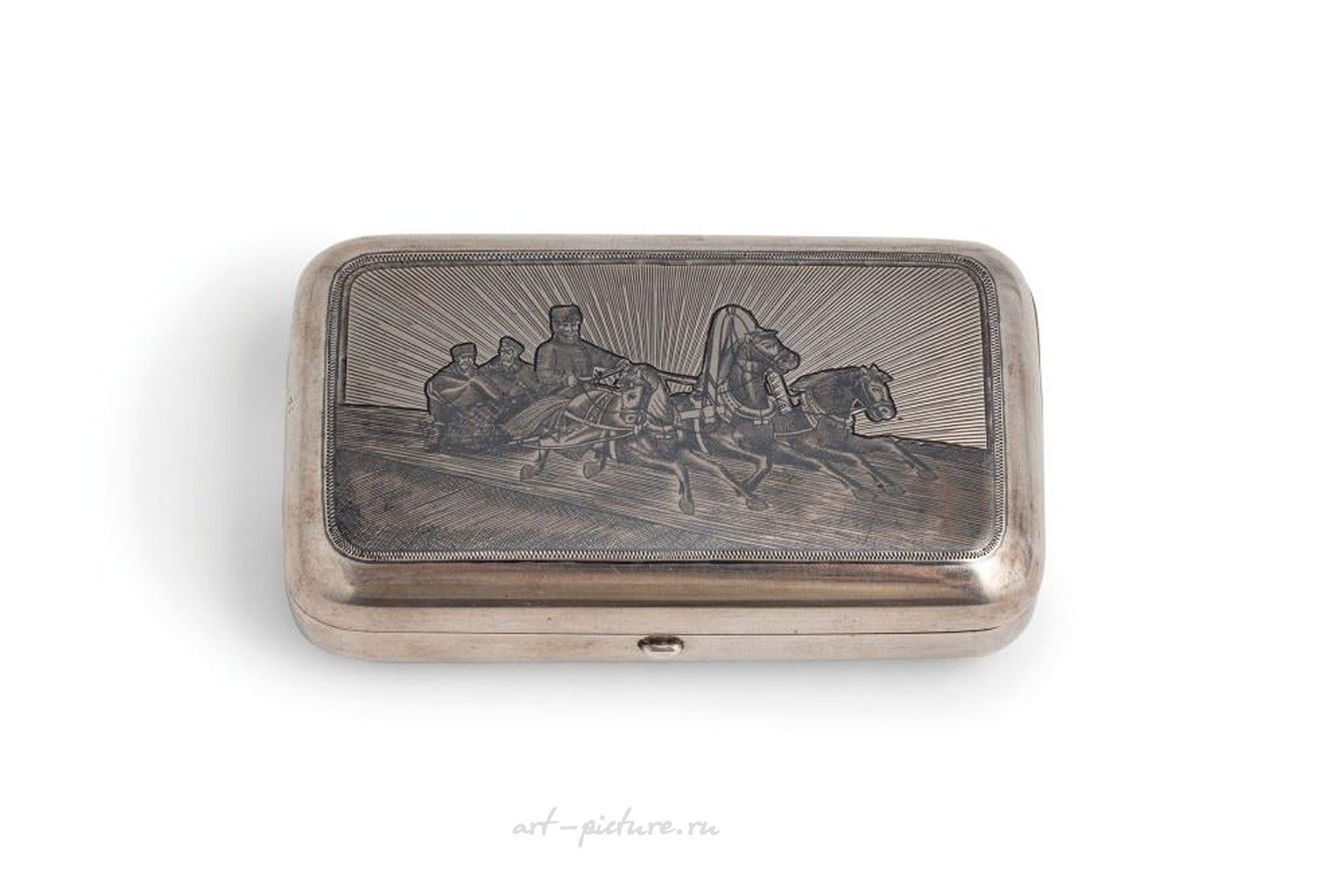 Прямоугольной формы с закругленными углами, на крышке изображена тройка; дефекты. Высота: 3 см, ширина: 10,5 см, глубина: 6,5 см; вес: 156 грамм. Русская серебряная и нефритовая табакерка с ниелло, Москва, 1884 год, марки А. Егарова; дефекты.