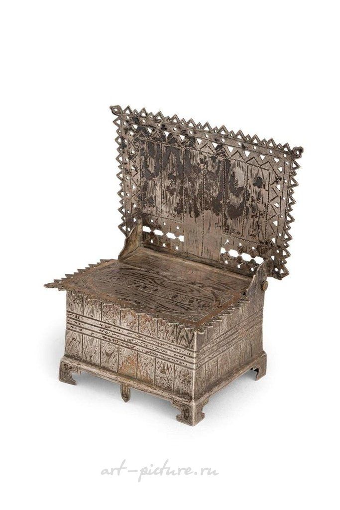 Русская серебряная сольница-трон, Москва, около 1890 года; дефекты. Она имеет четыре ножки, корпус, сиденье и спинку, полностью украшенные в стиле тромп-л'оэль. Высота: 9,5 см, ширина: 8 см, вес: 106 грамм.