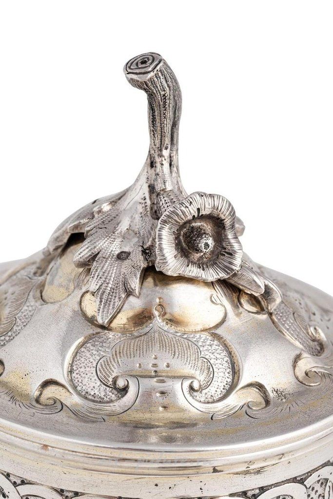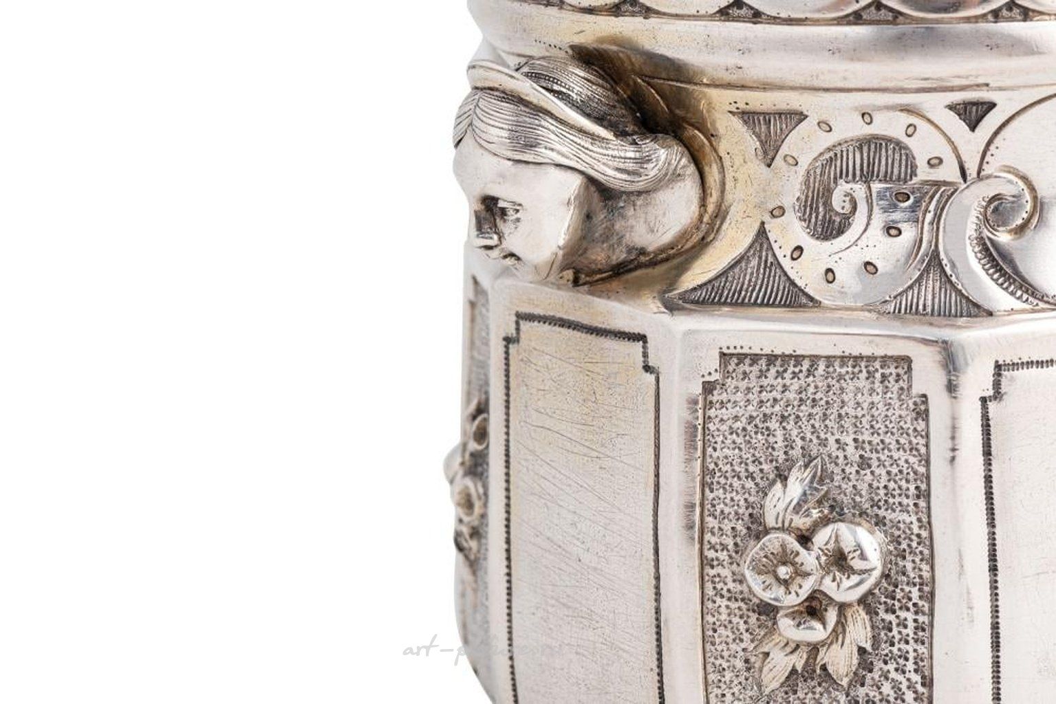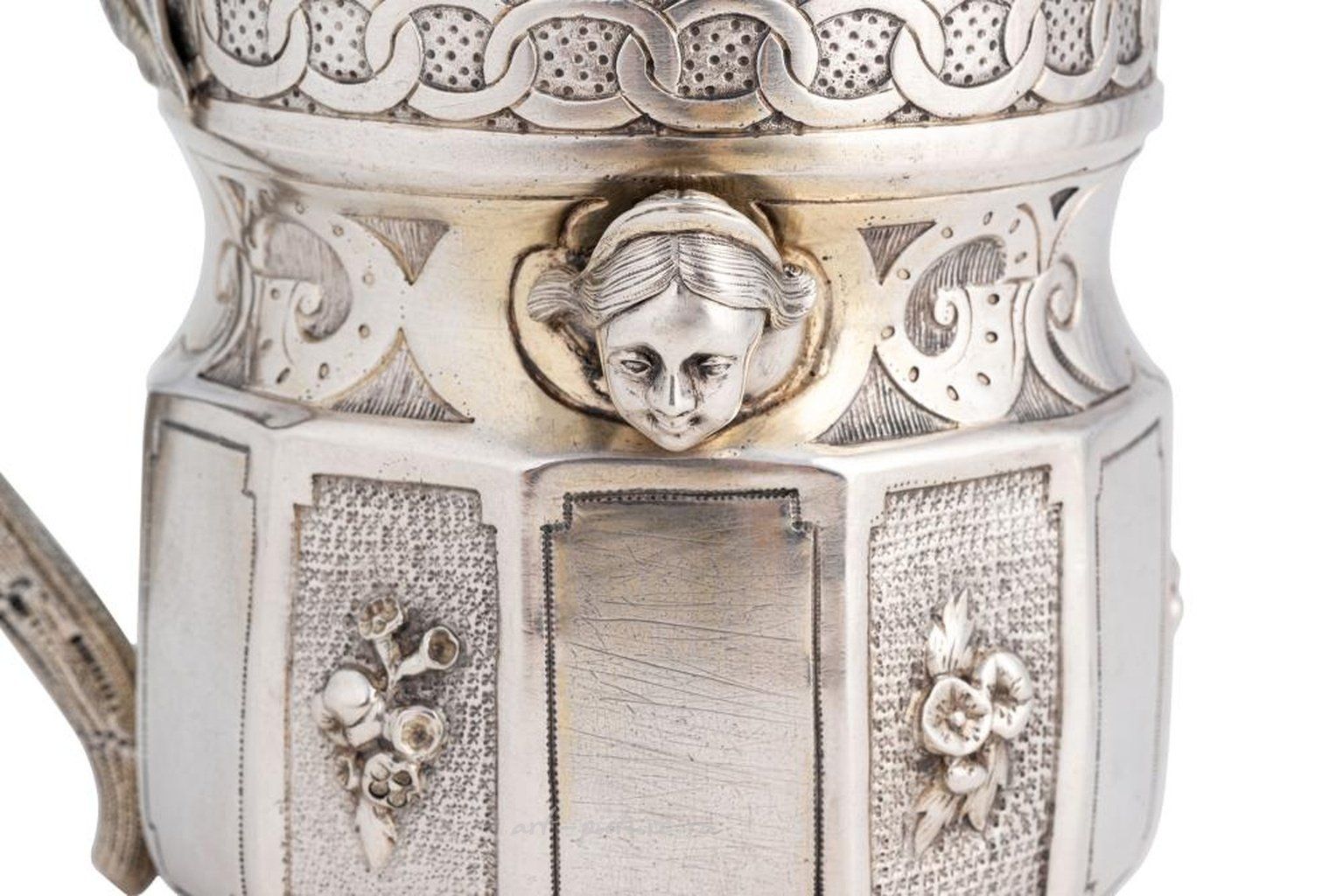 Округлое основание, бочкообразное тело с украшениями в виде виноградных лоз и гроздей, два выступающих лица, ручка в стиле трамп-л'оэй, крышка с натуралистичной рукояткой; дефекты. Высота 19 см, ширина 15 см; вес 521 грамм. Русская серебряная кружка, Санкт-Петербург, 1855 год, отмечена Ф.В. Зенгбушем.
