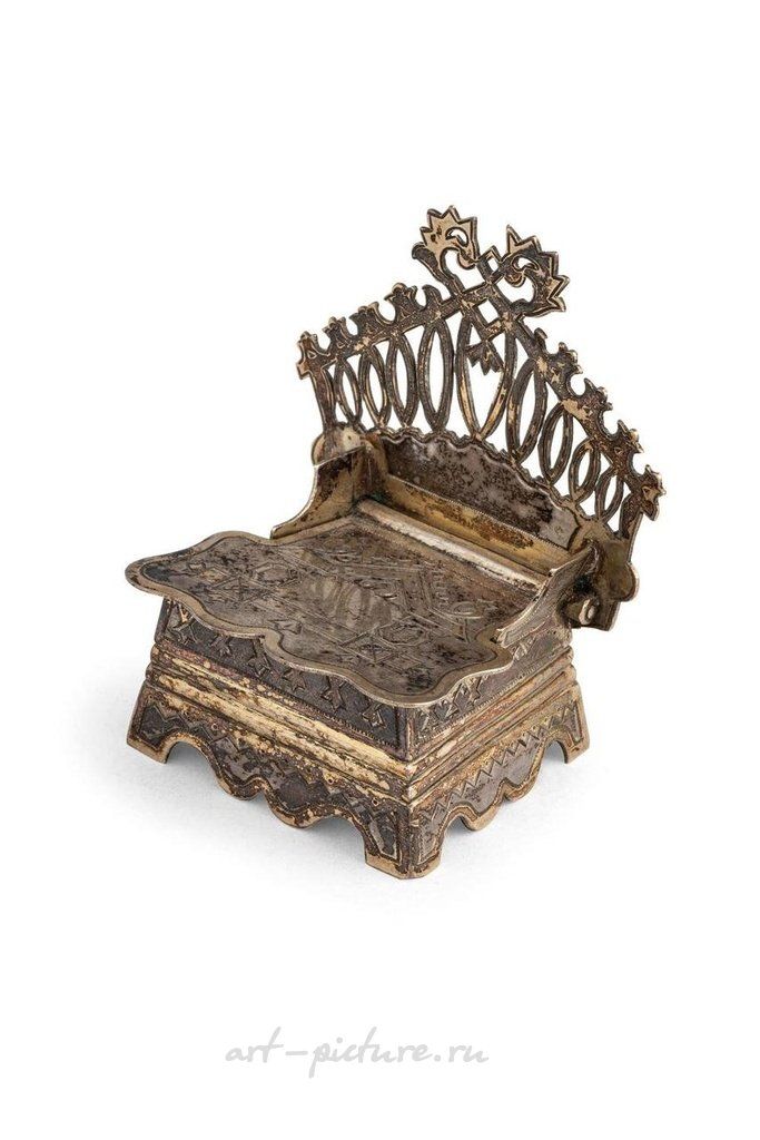 На четырех ножках, корпус и сиденье украшены геометрическими мотивами, спинка прорезана; дефекты Высота: 6,5 см, ширина: 5,5 см. Русская серебряная солонка-трон, Москва, 1886 год; ДЕФЕКТЫ.