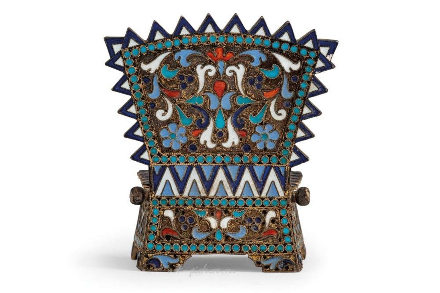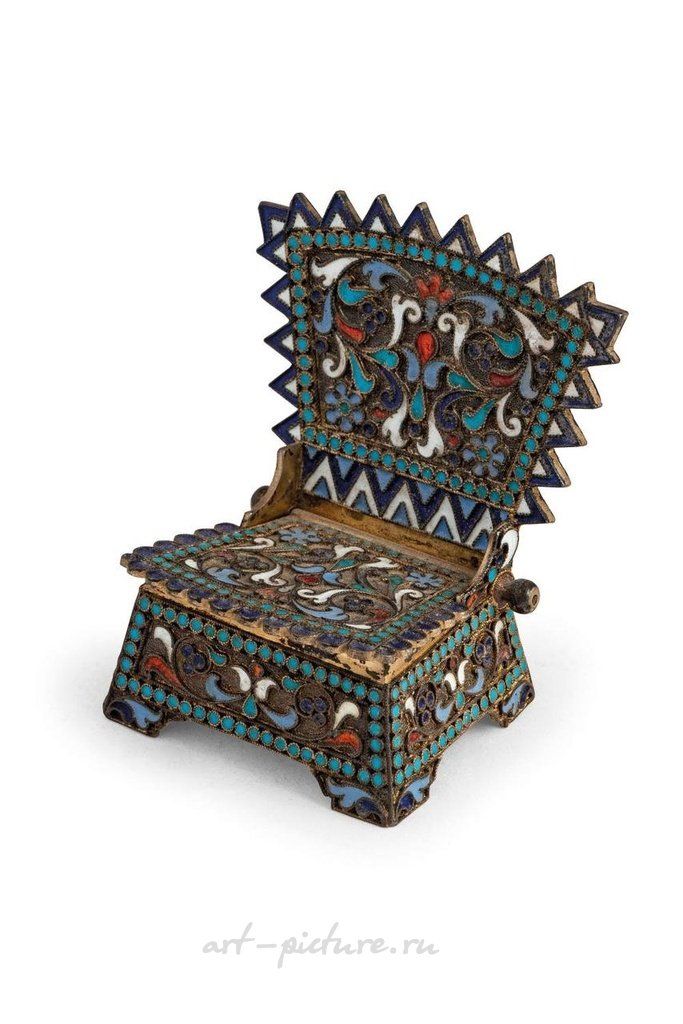 На четырех ножках, с спинкой и сиденьем с крышкой в форме шпиля, поверхность полностью украшена природными мотивами; дефекты. Высота 5,8 см, ширина 5 см; вес 52 грамма. Русская серебряная и эмалевая тронная солонка, Москва, 1896 год, марки И. Д. Салтыкова; дефекты.