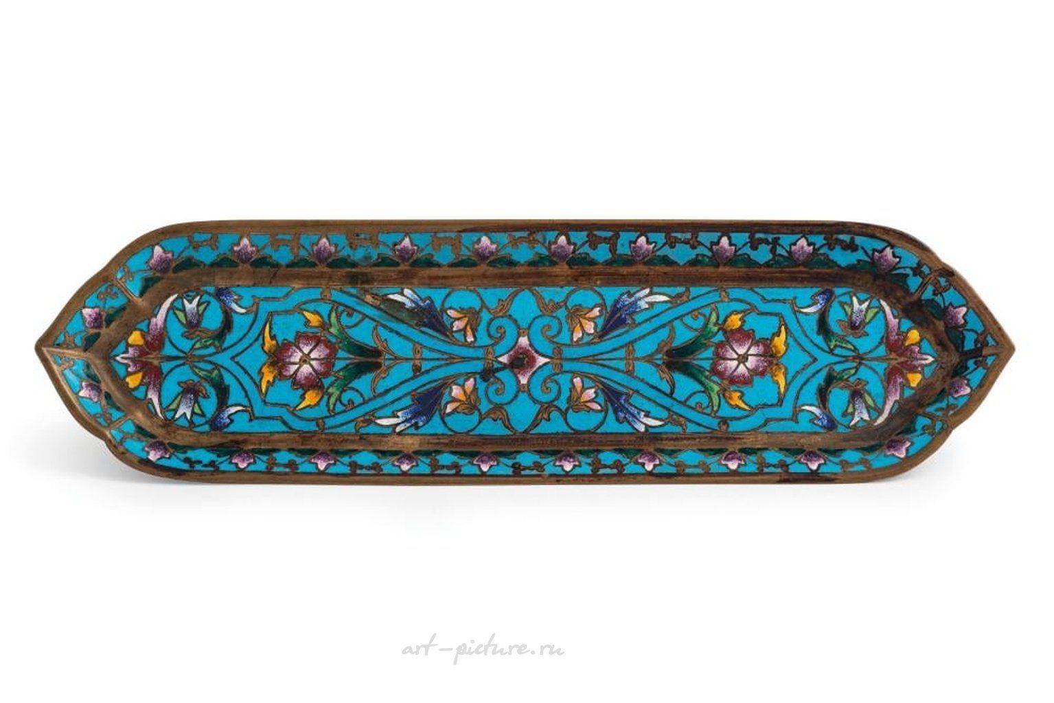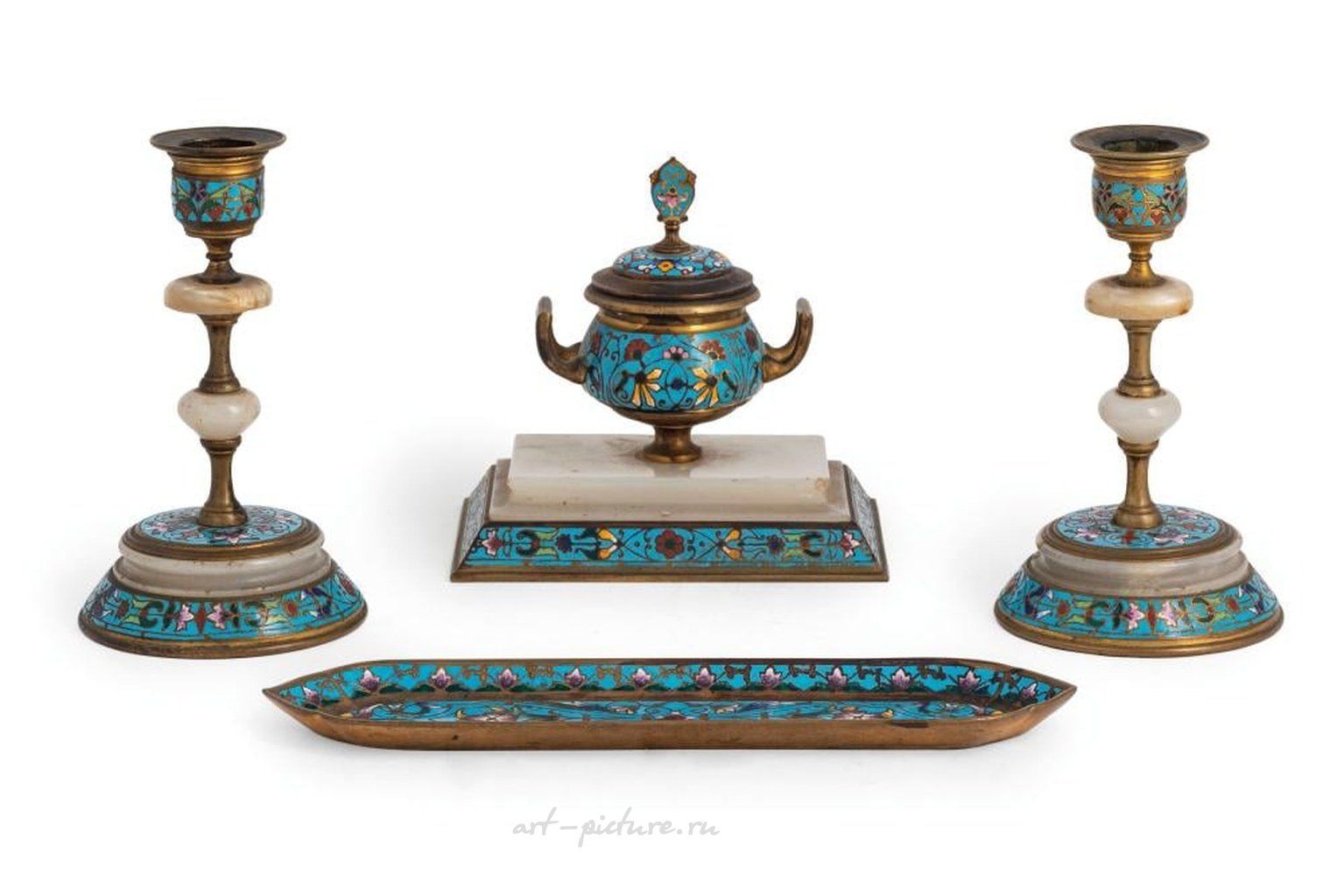 Состоит из прямоугольной основы подстаканника для чернил, держателя для ручек и двух круглых подсвечников на кольцевых узлах; дефекты Высота подсвечников 14 см. РУССКИЙ МЕТАЛЛ, ЭМАЛЬ, АЛАБАСТР И МАТЕРИАЛ ИЗ ЖЕМЧУГА НА СТОЛ, 19-20 ВЕК; ДЕФЕКТЫ (4)