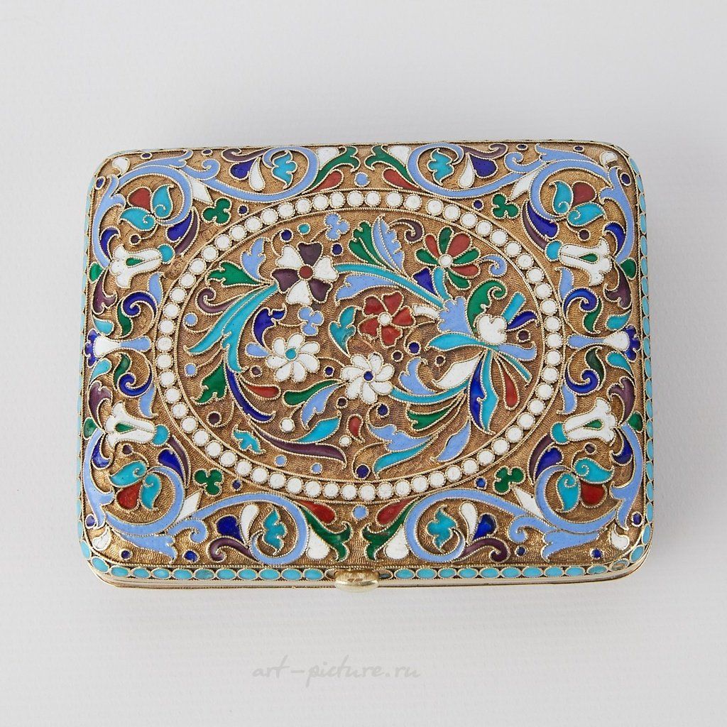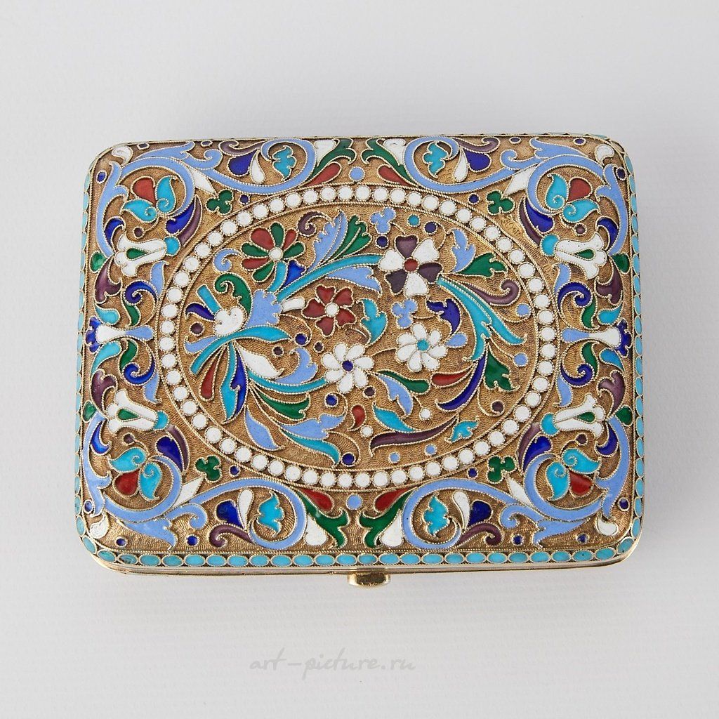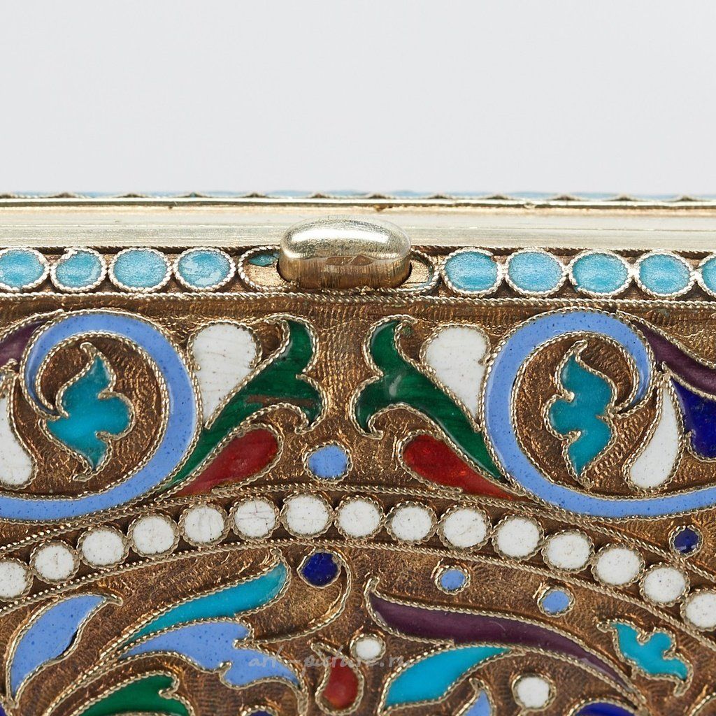 Русский серебряный эмалевый сигаретный футляр с кнопочным замком. Украшен вездеходом из листьев, овальной бисерной картушкой и цветами. Выполнен с оттиском по центру 875 и оттиском на передней и задней сторонах с маркой производителя Сергея Шапошникова, Москва, и 84 кокошником Ивана Сергеевича Лебедкина, около 1898-1908 гг. Происхождение: Известная коллекция г-на Джеймса Ли С...