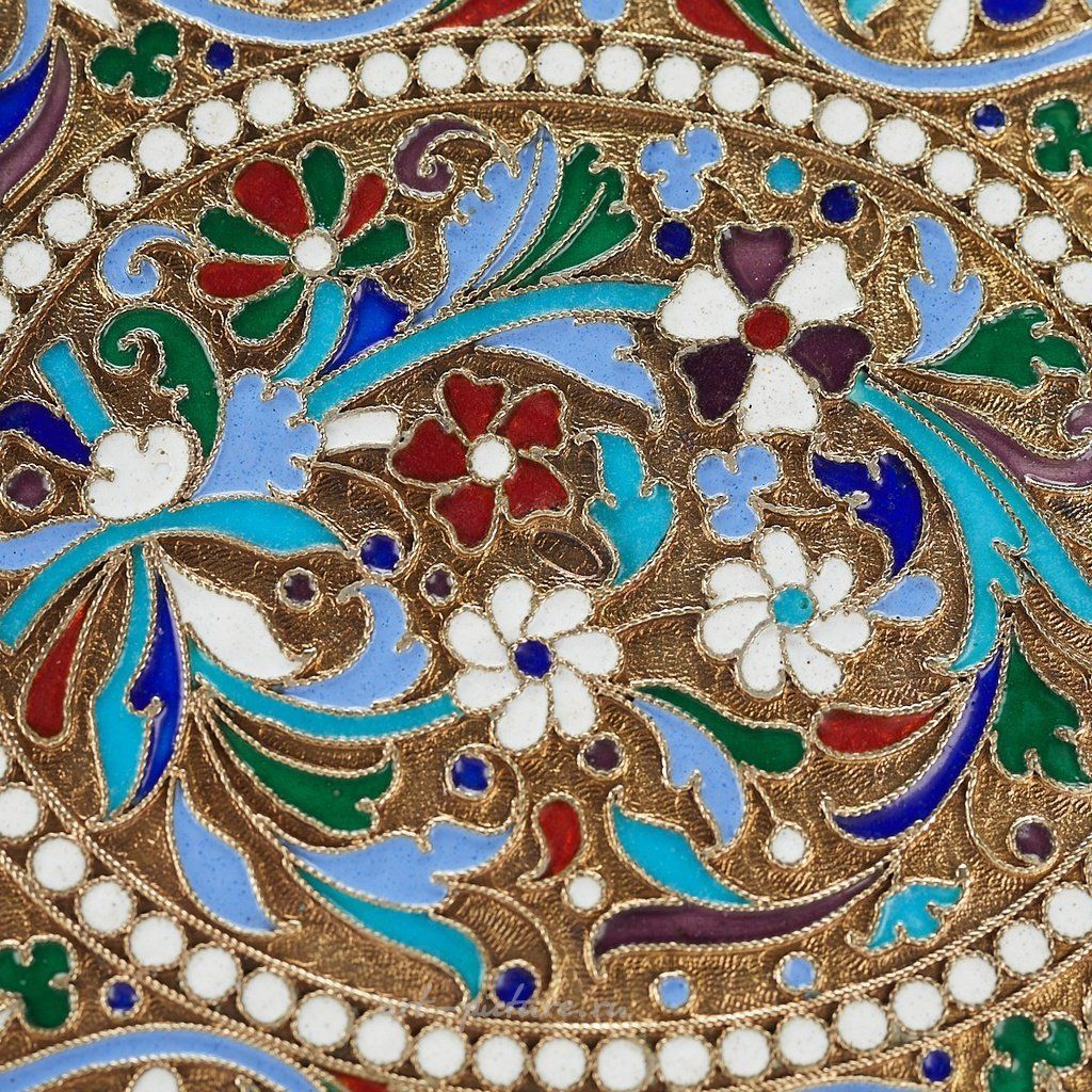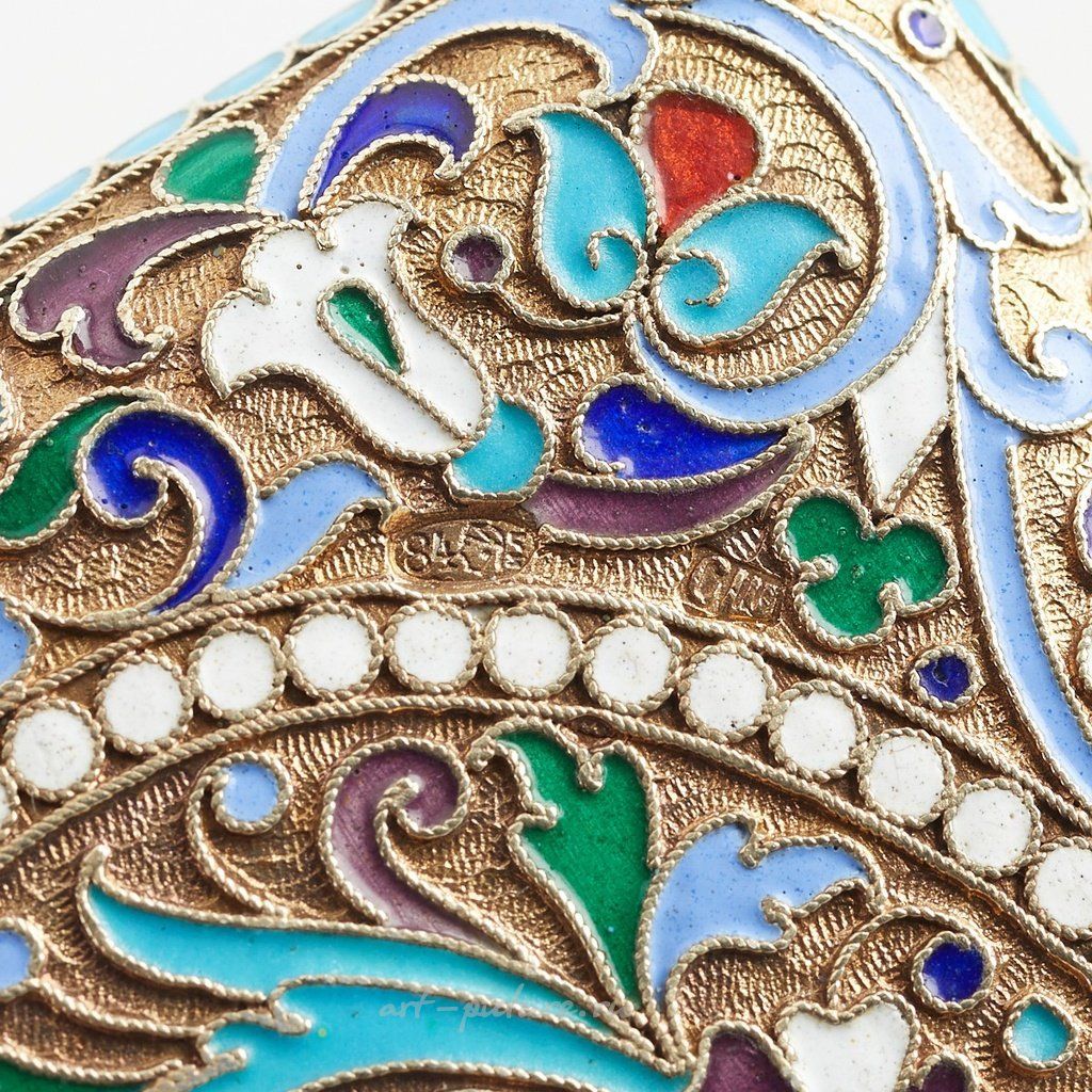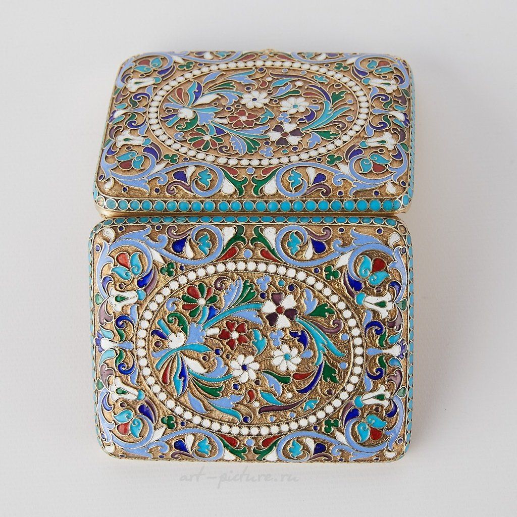 Русский серебряный эмалевый сигаретный футляр с кнопочным замком. Украшен вездеходом из листьев, овальной бисерной картушкой и цветами. Выполнен с оттиском по центру 875 и оттиском на передней и задней сторонах с маркой производителя Сергея Шапошникова, Москва, и 84 кокошником Ивана Сергеевича Лебедкина, около 1898-1908 гг. Происхождение: Известная коллекция г-на Джеймса Ли С...