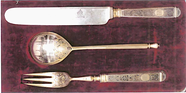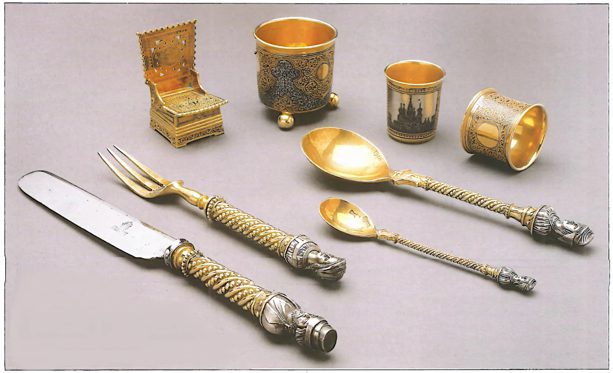 Сначала русские мастера копируют Запад. Но очень быстро у них появляется собственный почерк. Они создают то, что невозможно встретить в Лондоне или Париже: тяжёлые половники с эмалевым орнаментом, ложки с «говорящими» ручками, дорожные наборы с гордыми фигурками в национальных одеждах. Серебро становится языком эпохи. Попробуйте побыть детективом: если вглядеться в вилку или ложку, вы поймёте — это не просто семья, это новая уверенность в себе, мужество жить иначе.