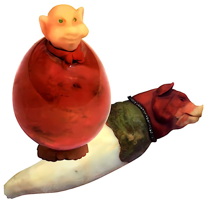 Например, комичный образ свиньи из родонита, выглядывающей из грубо обработанной редьки из кварца — тонкий намек на Германию. Или пробка в виде лазуритовой головы барана, уверенно носящего красную турецкую феску, что не оставляет сомнений в его функции и контексте.