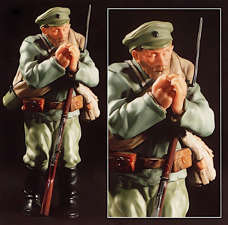 К примеру, среди коллекции Минералогического музея имени академика А.Е. Ферсмана РАН в Москве к числу выдающихся работ относится скульптура пожилого солдата, выполненная из калканской яшмы. В этой детали ощущается глубокая связь с народу; фигура, пытающаяся закурить папиросу, является отражением повседневной жизни. Творение будет замечено за богатство текстур и цвета, что создает эффект застиранной гимнастерки и вселяет жизненное восприятие. Напротив, работа хотя и менее декоративна, но пронизана искренностью и практической привязанностью к реальности. Тщательная проработка каждой детали, от двухглавого орла на подпоясанном ремне до кокарды с цветами флага, позволяет увидеть в этом символичном образе нечто большее, чем простая игрушка.