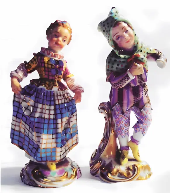 Кроме того, среди творчества этого скульптора можно встретить две маленькие фигурки танцующих детей, которые можно сосчитать среди персонажей Комедии дель арте. Скорее всего, они изображают Коломбину и Арлекина, однако оформление их костюмов явно указывает на более поздние стилистические влияния, возникшие под воздействием французского подхода к изображению комедийных актеров. Водоворот красок, клетчатые элементы и изысканные детали — всё это создает особую атмосферу. Костюм Коломбины был оформлен в духе французского стиля с необычным сочетанием оттенков и нарядной шляпкой, тогда как Арлекин предстает в игривом и ярком одеянии с щедрыми узорами.
