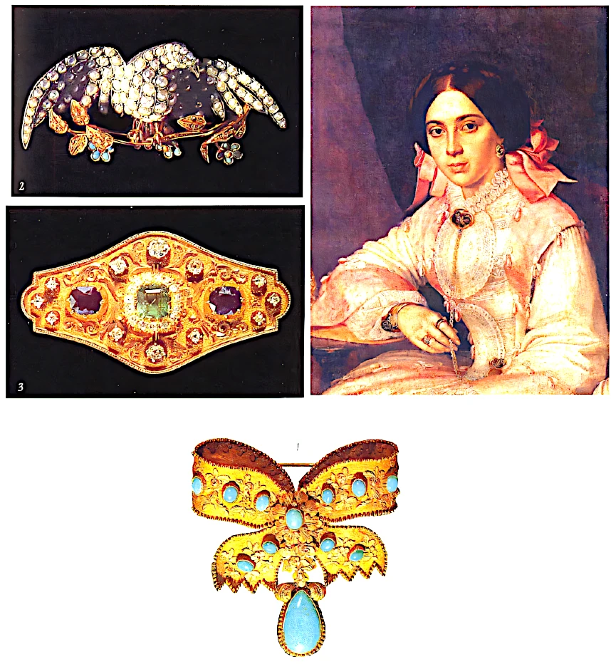 К середине века украшения раскрываются заново: гребни из резной слоновой кости, броши-камеи, агаты, янтарь, бирюза в серебре и золоте. Санкт-Петербург и Москва словно спорят между собой не хуже Парижа и Лондона — кто ближе к будущему, кто хранит корни. Петербург — быстрый, технологичный, с холодным блеском; Москва — сдержанная, добрая, традиционная.