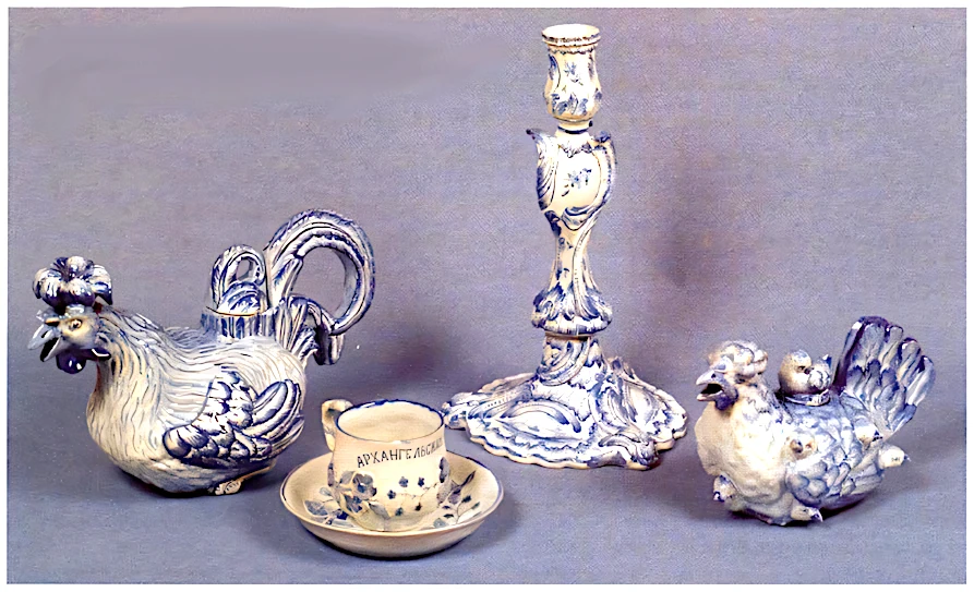 Украшения английских, голландских, французских, даже китайских фабрик — здесь не просто копируются, но интерпретируются. Всякому узору — свой русский смысл. Тарелки с зелёно-коричневой поливой напоминали о британской моде на имитации \"панциря черепахи\", чашки с надписью "АРХАНГЕЛЬСКАЯ ФЕРМА" — об идее локальной маркировки, горшки и солонки — о ручном мастерстве на тонкой грани с наивом.