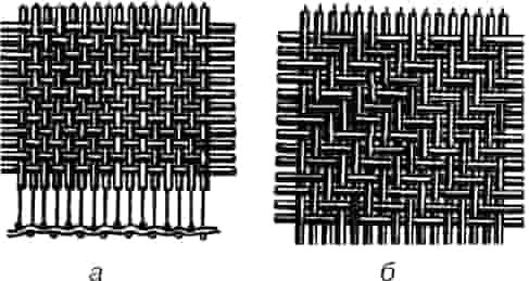 Большинство холстов итальянских, испанских и германских живописцев XV–XVI вв. по своей фактуре представляют собой довольно сложное переплетение крученых пеньковых или льняных ниток, выполненное ручным способом (рис. б). Многие живописцы конца XVI в. употребляли в качестве живописного холста исключительно саржевую ткань. Тинторетто, Тициан, Веронезе, многие фламандские и голландские живописцы писали исключительно на саржевых холстах. Это объясняется тем, что благодаря саржевому характеру переплетения нитей сцепление между частицами грунта и поверхностью саржевого холста значительно больше, нежели в обычном. Кроме того, все физико-механические внешние воздействия в меньшей степени сказываются на грунте, лежащем на саржевом холсте, чем на грунте, лежащем на простом холсте (рис. а).