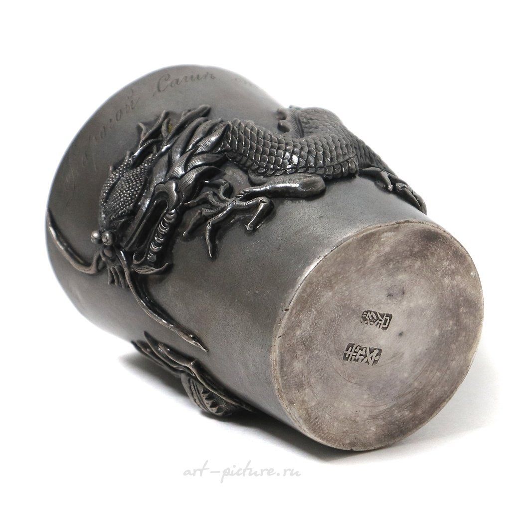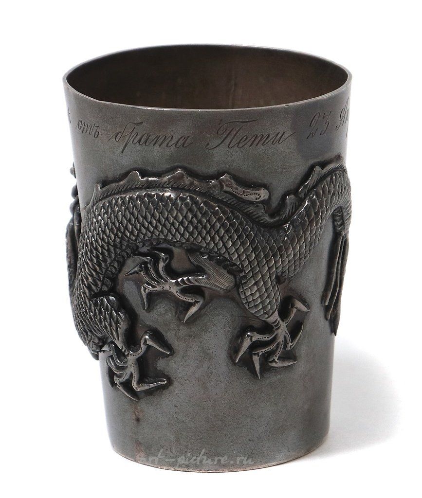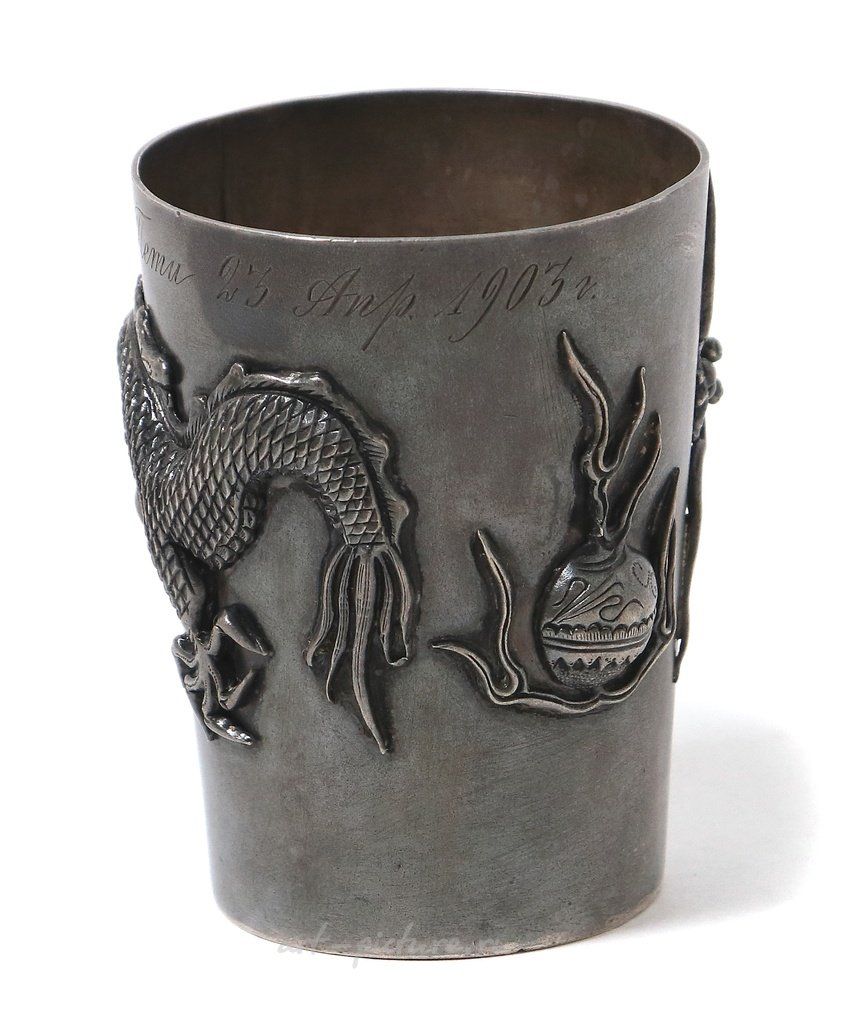 这只杯子是中国制造的,源自我们祖先开始开发的远东地区。中国的珠宝匠在自己的创作中融入了中国传统装饰元素和俄罗斯帝国的徽章(浮雕徽章上描绘了圣乔治骑士用剑击败龙的场景)。杯子,产自中国,重112克,高7.8厘米,顶部直径5.7厘米。