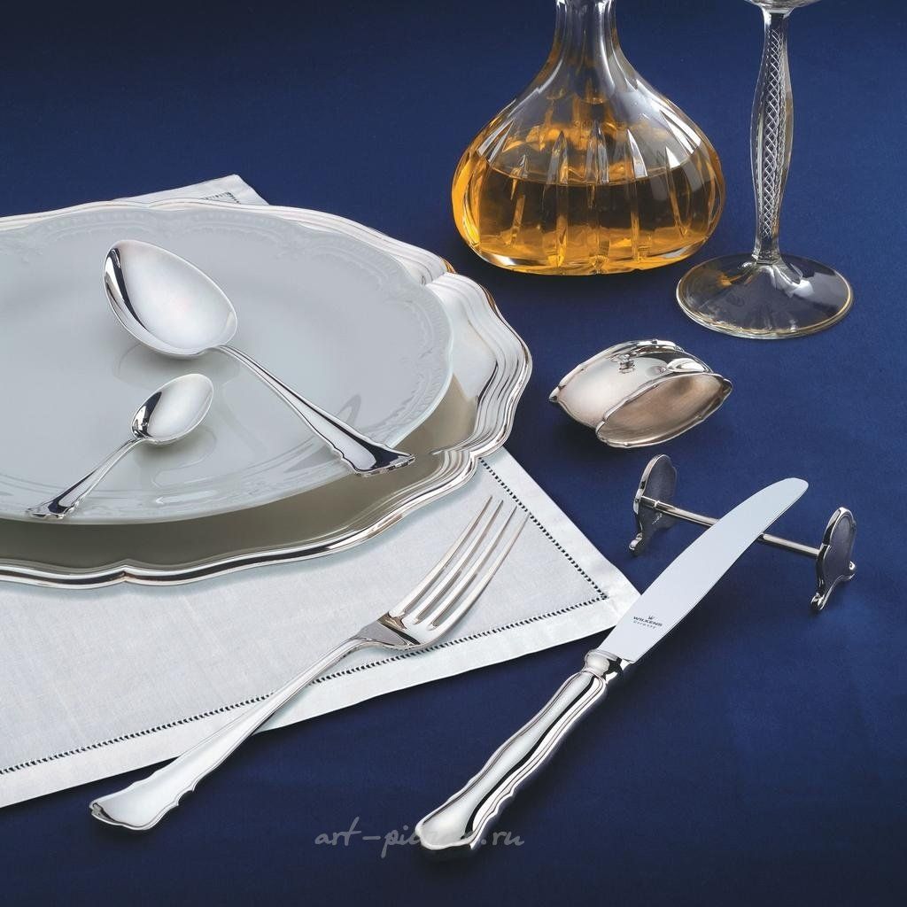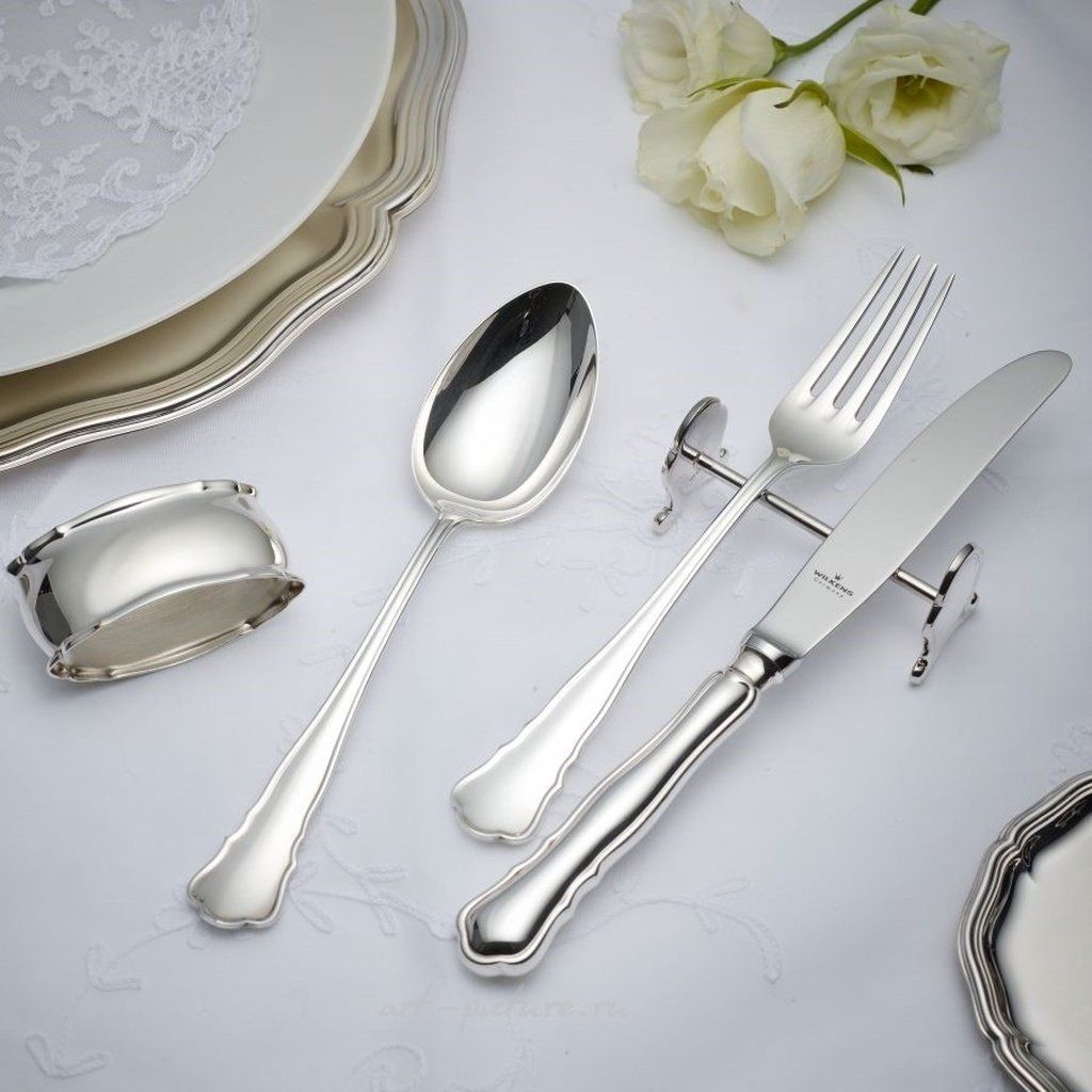 Столовый набор CHIPPENDALE от WILKENS из 24 предмета из серебра Красота форм в стиле рококо. Томас Чиппендейл, мастер-краснодеревщик, оказал определяющее влияние на английский стиль рококо XVIII века. Как и его мебель, столовые приборы, носящие его имя, отличались легкостью и живостью. Благодаря слегка плавным линиям и типичному, выразительному профилю, узор CHIPPENDALE является классическим в коллекции WILKENS с 1910 года. Столовые приборы WILKENS CHIPPENDALE представлены в различных вариантах сервировочных предметов и аксессуаров для стола. WILKENS — Ценные столовые приборы и аксессуары для сервировки стола из серебра, изготовленные в лучших традициях производства с 1810 года. Серебро от WILKENS: Неповторимо красиво. Богатая история серебряной мануфактуры WILKENS в Бремене была сформирована увлеченными людьми, обладавшими тонким чувством изысканной элегантности и утонченности. С момента основания компании мастером-ювелиром Хансом Мартином Вилкенсом в 1810 году, серебряная мануфактура WILKENS превратилась в международную компанию, поставляющую взыскательным клиентам по всему миру изысканные серебряные столовые приборы, например... Отель Four Seasons, Гамбург Ресторан Pades, Верден ИНТЕРКОНТИНЕНТАЛ, Гамбург различные отели Штайгенбергера различные клубы Робинсона КЕМПИНСКИ, Кёнигштайн/Таунус Замок Хугенпоэт, Эссен Отель Jumeirah Beach, Дубай различные посольства/правительственные здания.