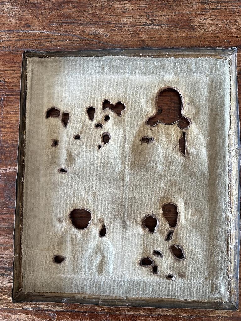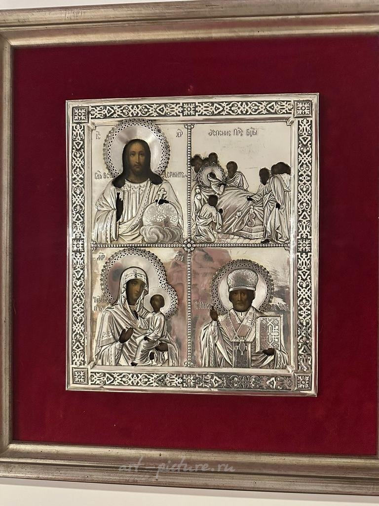 主要特征: 1. 银质圣像衣(外罩): 敲制银器,含银量84标(俄罗斯标准)。 2. 工匠与年代: 带有工匠"AA"(安德烈·阿德勒,莫斯科著名银匠)的标记,以及检验师"A.Ф"的标记,确认年代为1888年,产地为圣彼得堡。 3. 绘画: 以油画技法绘制在木板上,采用学院派风格。画作原貌保存,无任何损失,展现出极高的艺术水准。 4. 独特特点——完整无缺: - 这尊圣像极为罕见地以完整、最初的形态保存至今。 - 保留了绘画与银罩之间的原始天鹅绒衬垫。 - 木板背面完全包覆着原装天鹅绒——这是高档定制和精心保存的标志。 5. 题材内容: 画面表现了四位中心的东正教圣像:提赫温圣母、全能救世主、圣尼古拉奇迹者和圣母安息。 6. 尺寸: 高31.5厘米 × 宽26.8厘米。 7. 品相: 整体保存状况极佳。银罩有与年代相符的自然均匀磨损。绘画及两处天鹅绒包覆均保持极佳状态。