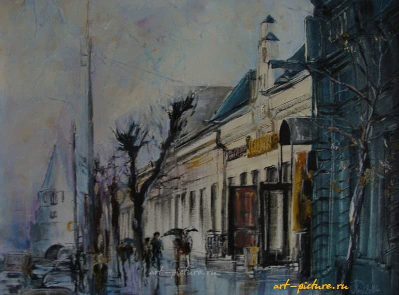 Как же великолепно передана зимняя атмосфера! Эти старинные здания с их изящными арками и отражением на мокрой мостовой создают ощущение уюта даже в холодный день. Прекрасный баланс реализма и экспрессионизма делает этот городской пейзаж живым и полным эмоций.