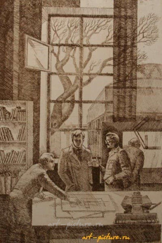 Что, по вашему мнению, говорит сцена из офисного помещения конструкторского отдела о роли человека в процессе создания и восприятия технологий, особенно в контексте середины двадцатого века? Возможно, это изображение поднимает вопросы о том, как мы воспринимаем труд и достижения человека, когда многое из этого уже стало частью нашего повседневного быта?