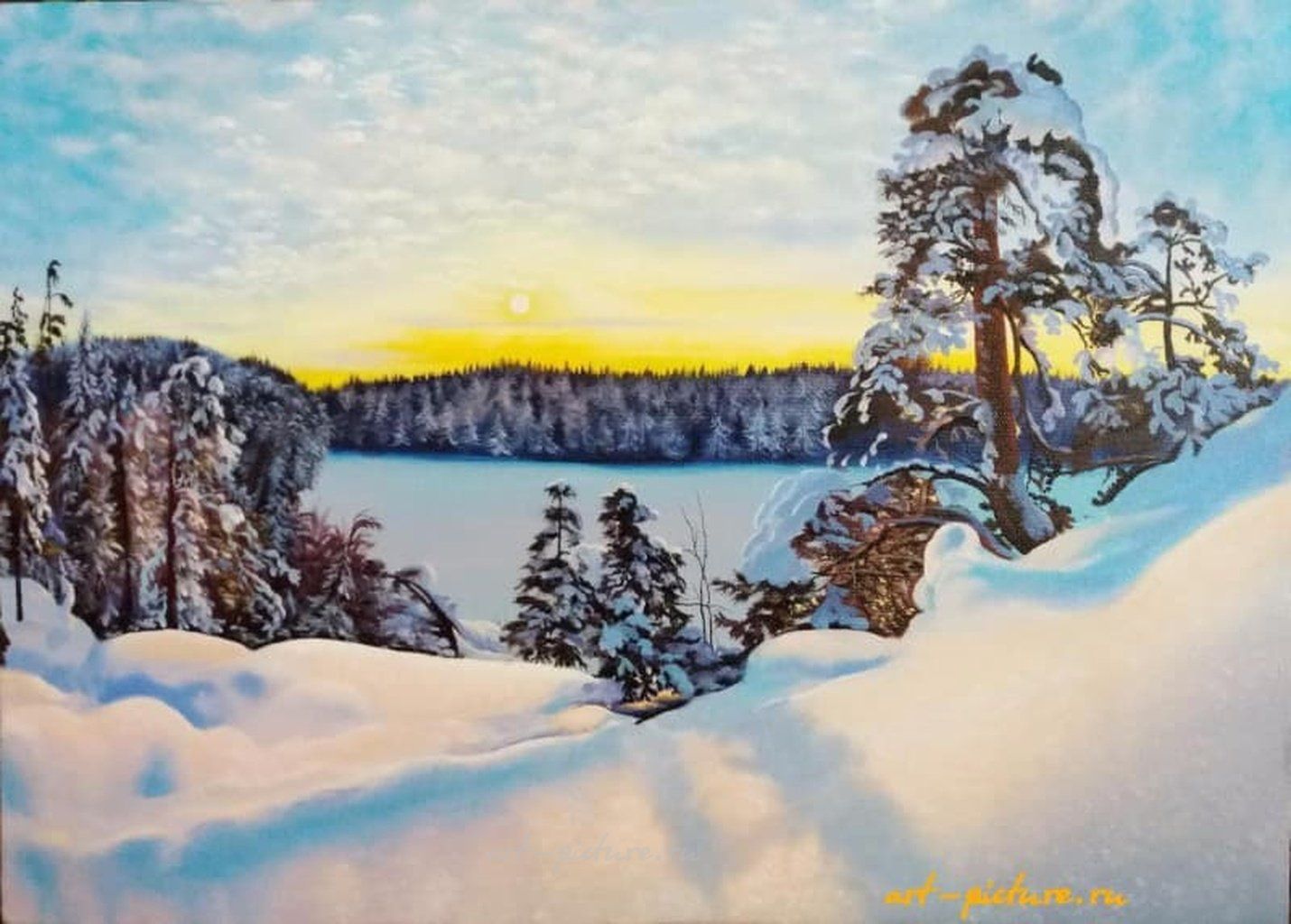 Эта картина вполне может быть написана в стиле импрессионизма! Это когда художники стараются передать свои чувства и впечатления от природы, используя яркие цвета и нежные мазки. Здесь видно, как теплые оттенки заката встречаются с холодом зимы, создавая волшебную атмосферу.