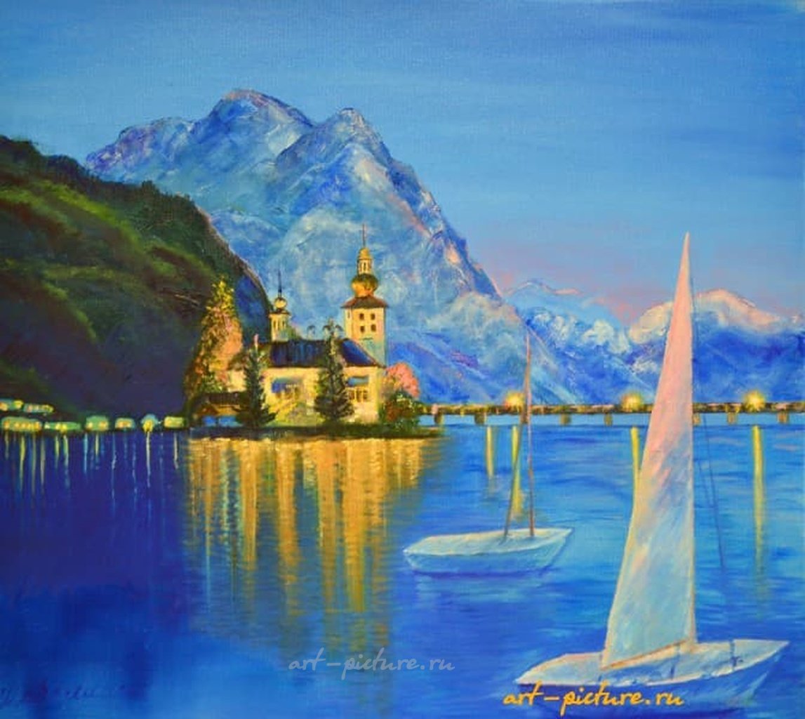 Какая потрясающая картина! Насыщенные цвета и отражения на воде действительно создают ощущение волшебства и умиротворения. Архитектурный ансамбль на фоне гор выглядит так гармонично, что хочется забыть о времени и просто насладиться этим прекрасным моментом.