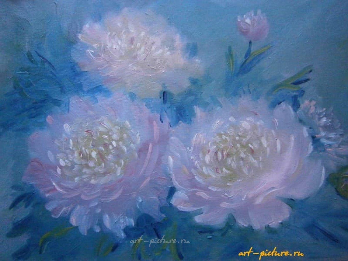 Работа выделяется на фоне других представленных картин своей гармонией в цветах – нежные бело-розовые оттенки пиона на переднем плане контрастируют с размытым синим фоном, что помогает специфику цветовой палитры более глубоко изучить. Художник прекрасно использовал технику "а-ля прима", что позволяет ему создать эффект живой, дышащей сущности каждого цветка. Эту технику используют для написания картин без промежуточного слоя, что придаёт произведению особенно свежий и спонтанный вид, словно оно было написано одним вдохом.
