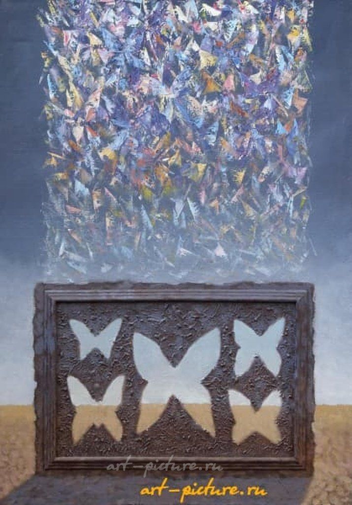 Картина впечатляет своим загадочным настроением и легкостью. Силуэты бабочек за окном создают иллюзию свободы и полета, а цветовые акценты наполняют работу жизнью. Этот современный стиль с нотками сюрреализма заставляет задуматься о природе нашего восприятия и о том, как границы между реальностью и фантазией могут быть размытими.