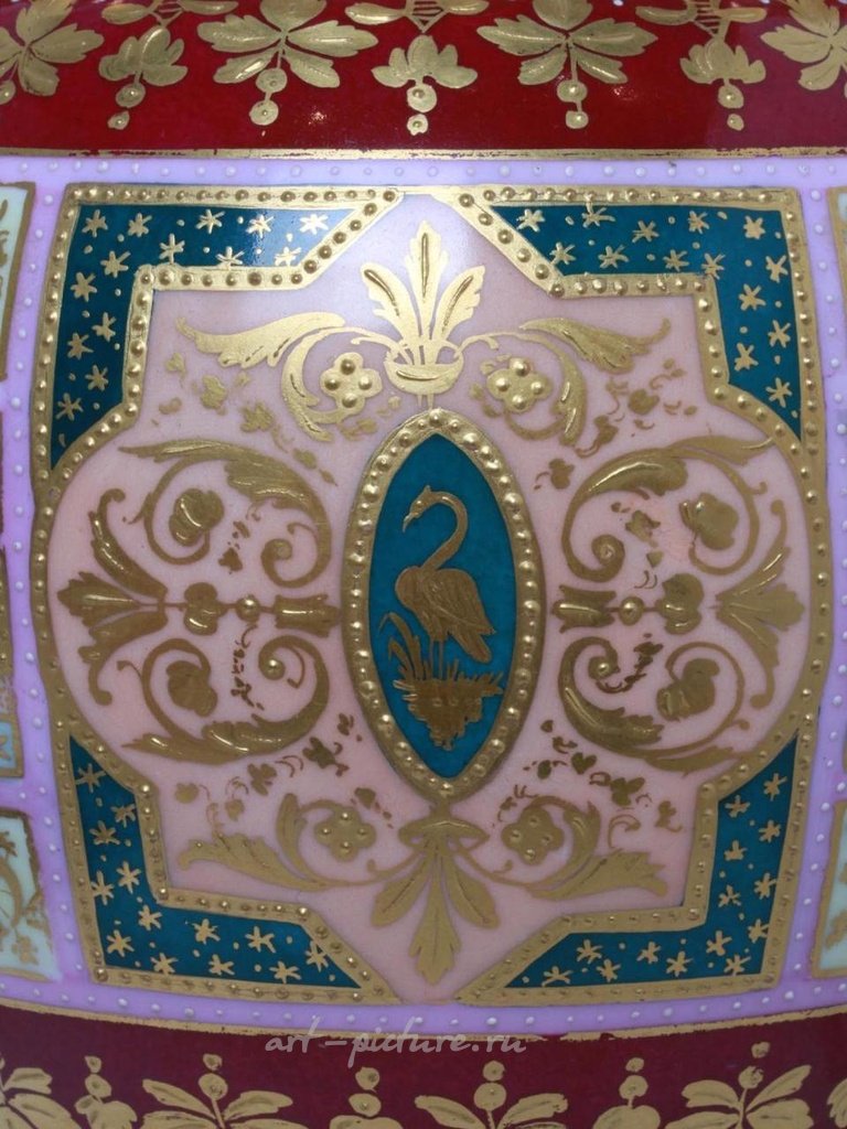 一个19世纪的奥地利维也纳乌尔恩花瓶,带有镀金的蛇形手柄。装饰着各种复杂的彩绘图案,并用镀金点缀,中央的圆形图案上画着一幅美丽的新古典主义场景,可能描绘的是巴黎和特洛伊的海伦。底部有蓝色墨水蜂巢标记。古董和复古的德国瓷器用具,家居装饰和收藏品。