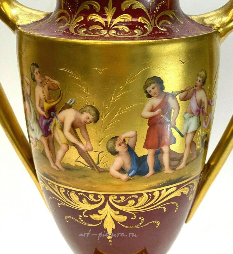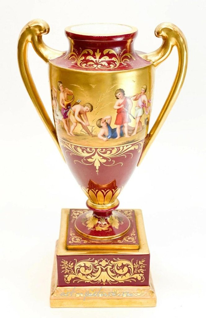 维也纳皇家手绘瓷器双柄瓮,约于1920年。深红色地面上手绘着中心区域的儿童各种活动。底部有维也纳皇家蜂巢标记。重量约为1磅,尺寸约为6.75英寸 x 3.75英寸 x 11英寸。国内运费:40美元。