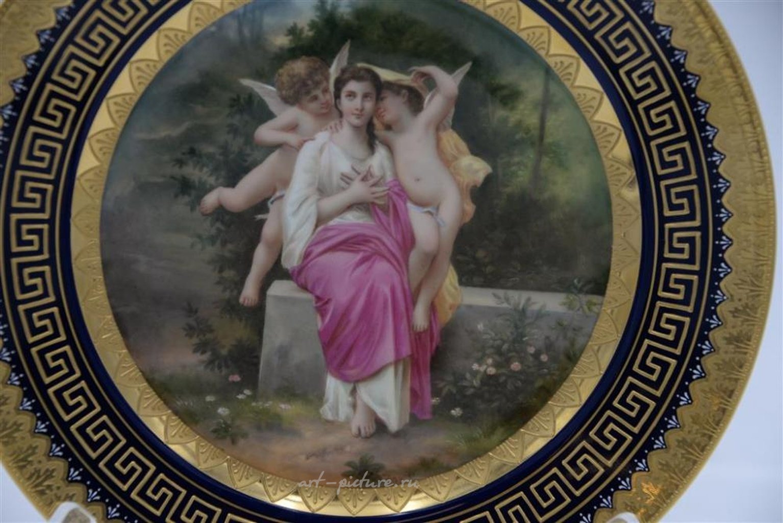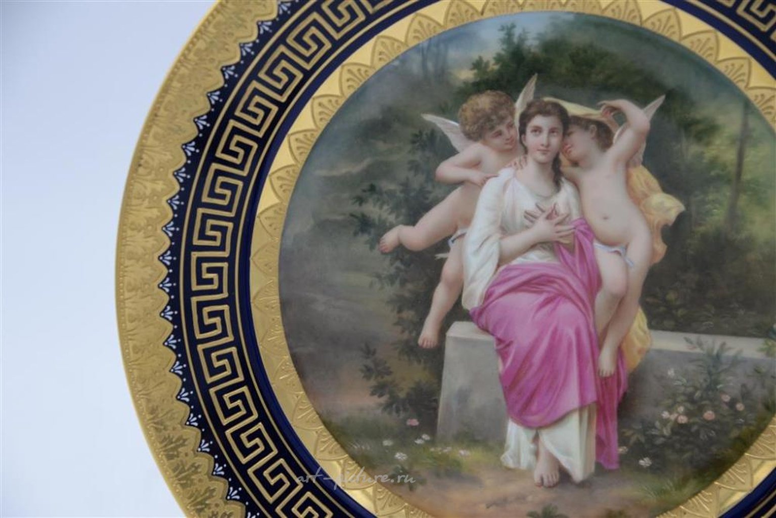 瓦格纳皇家维也纳肖像盘,中央绘有一位女性和两个小天使的场景,周边有高浮雕装饰,签名为“瓦格纳”,直径9.5英寸。