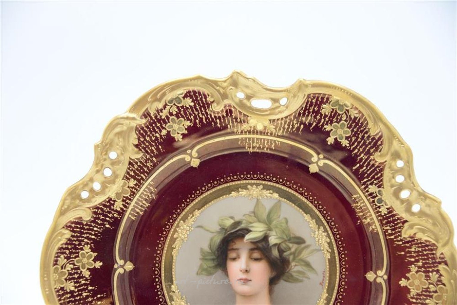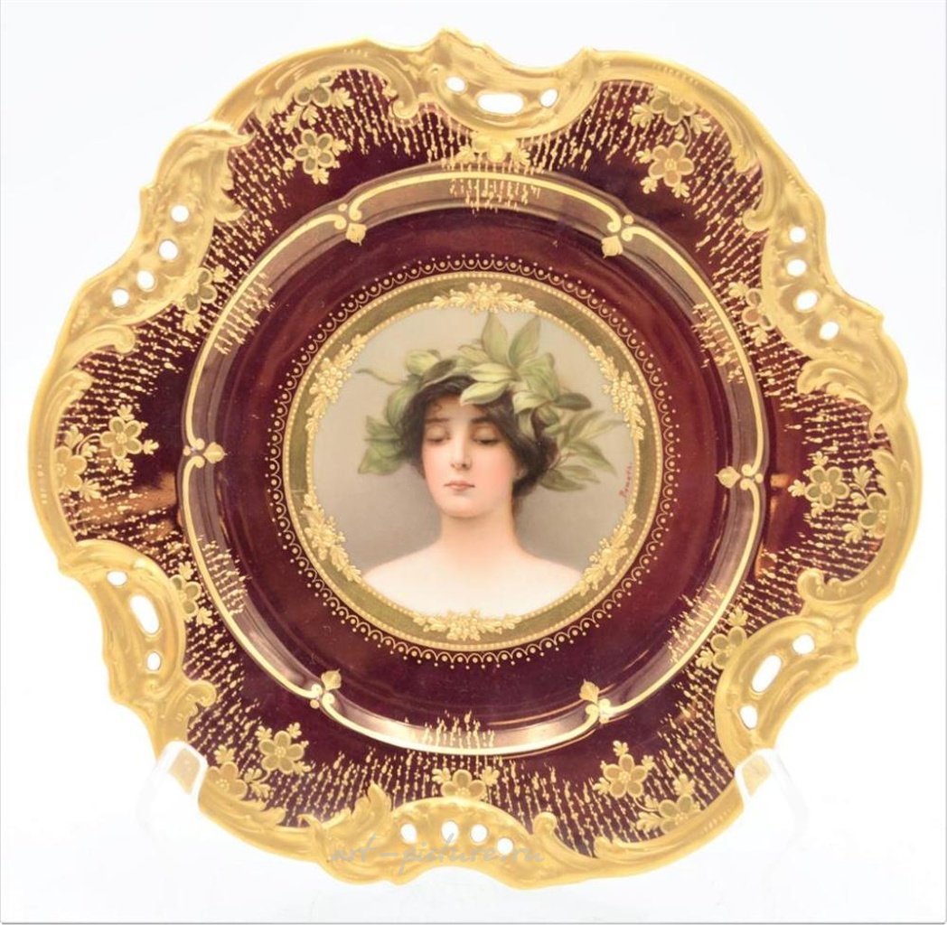 皇家维也纳人像盘,"达芙妮",带有高浮雕网状边框,右侧有"Donath"签名,反面有皇家维也纳蜂巢图案,还有"德国"和版权"法fullyGeschutzt"的盖章,以神话仙女达芙妮戴有月桂花环的形象为特色,直径9英寸。