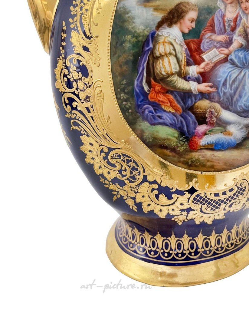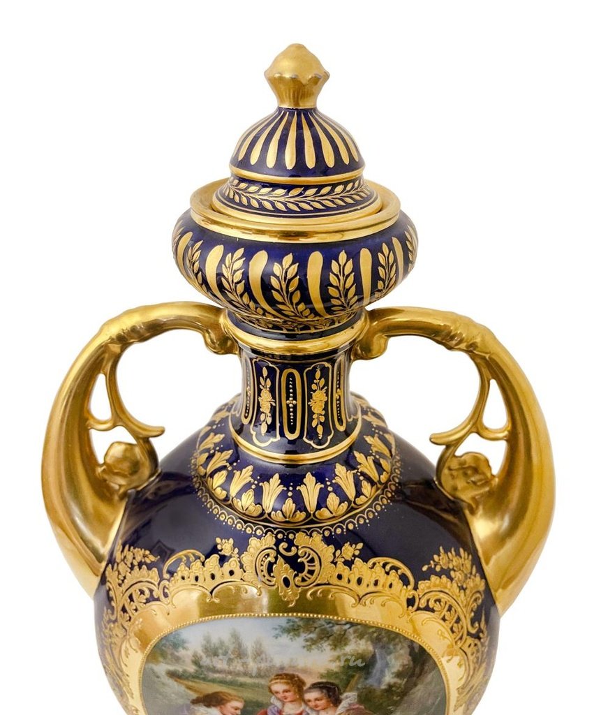 19世纪末20世纪初奥地利皇家维也纳手绘钴地面和金装饰的带盖瓮。 尺寸:19英寸 x 11英寸 x 5英寸。