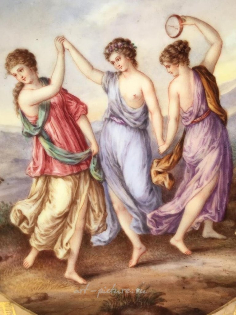 皇家维也纳三美神橱柜盘。盘子背面标有皇家蜂巢标记。直径为9 5/8英寸。(最外层金边有轻微磨损)。