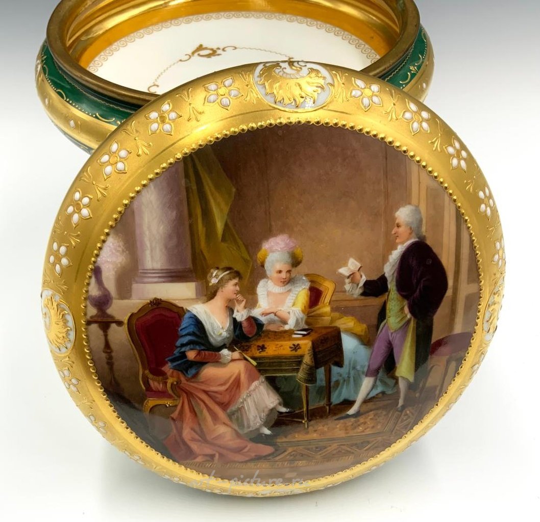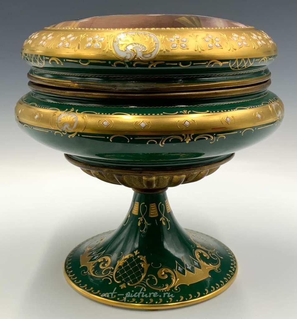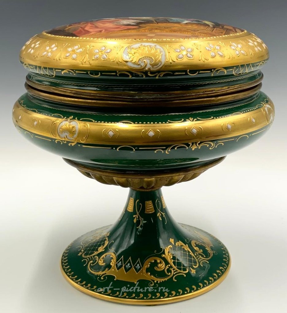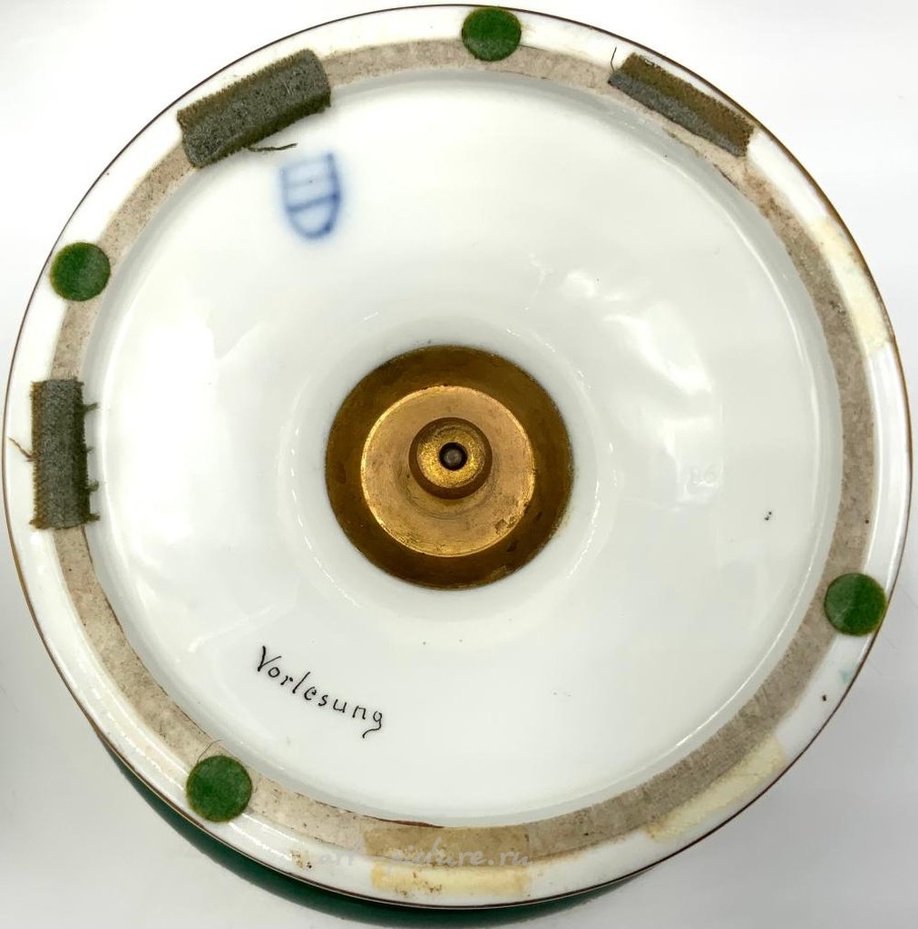 艺术家签名为"Schuler"。盖子边缘有一个不规则部分(见照片),但除此之外,整个作品状态良好。它高8 1/4英寸,直径7 1/4英寸。需要第三方运输或亲自取货。
