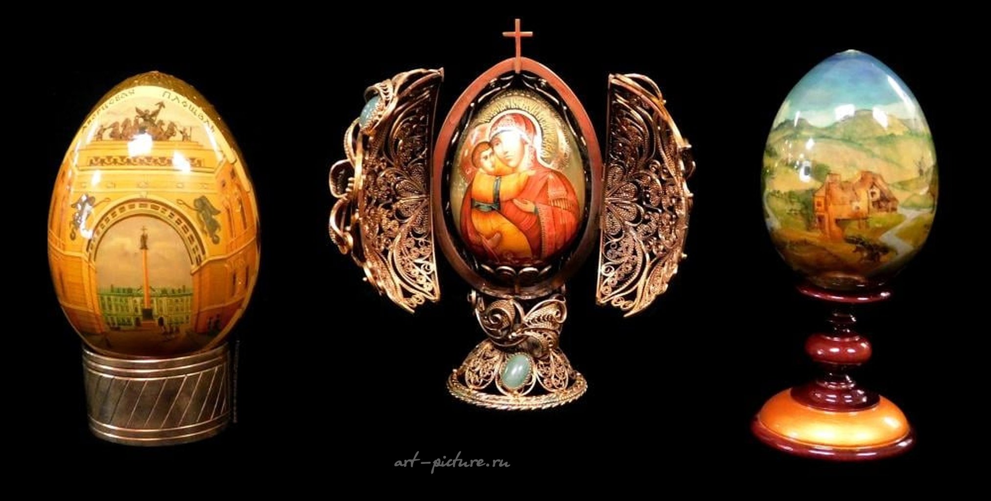 手绘的俄罗斯复活节彩蛋,放在底座上,共三个,其中包括:第一个是手绘的圣母玛利亚和婴儿耶稣的图像,绘制在木质彩蛋上,放在镀金金属盒子里,外面有两扇门,框架上装饰有两颗绿宝石,高度为5 3/4英寸;还有两个涂漆的纸浆彩蛋,都有签名,一个上面绘有圣母玛利亚和婴儿在山景背景下,另一个上面绘有著名的俄罗斯建筑,包括圣彼得堡广场。