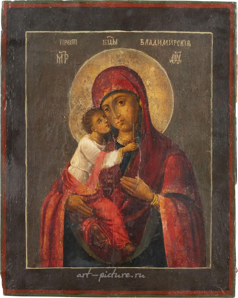 描绘了弗拉基米尔圣母的图标。19世纪中叶的俄罗斯图标。油画在木板上。光环由覆盖着金漆的银制成。修复过,背面有虫蛀。尺寸为28.7 x 23厘米。描绘了弗拉基米尔圣母的图标(弗拉基米尔斯卡)。俄罗斯,19世纪中叶。单板带有两个背面钉子(一个丢失)。