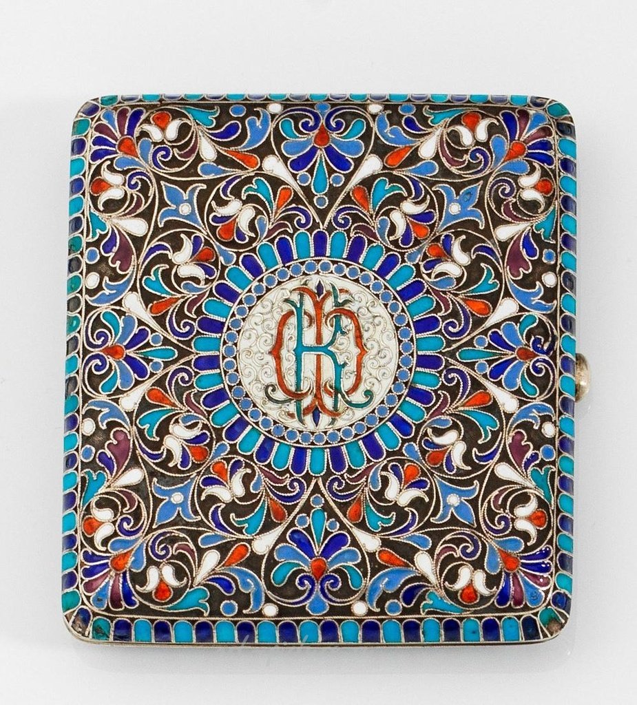 银制品,釉面。矩形形状,圆角和装饰性图案,两面都是用彩色花卉釉面技术制成的。中央有一个带有所有者字母的花朵图案。侧面有一个按钮。内部有部分镀金和黑色釉面,部分修复的铭文。标记为84,有鉴定印记和工匠印记。根据年代使用的迹象,内部磨损。重约170克。高度1.5厘米。8