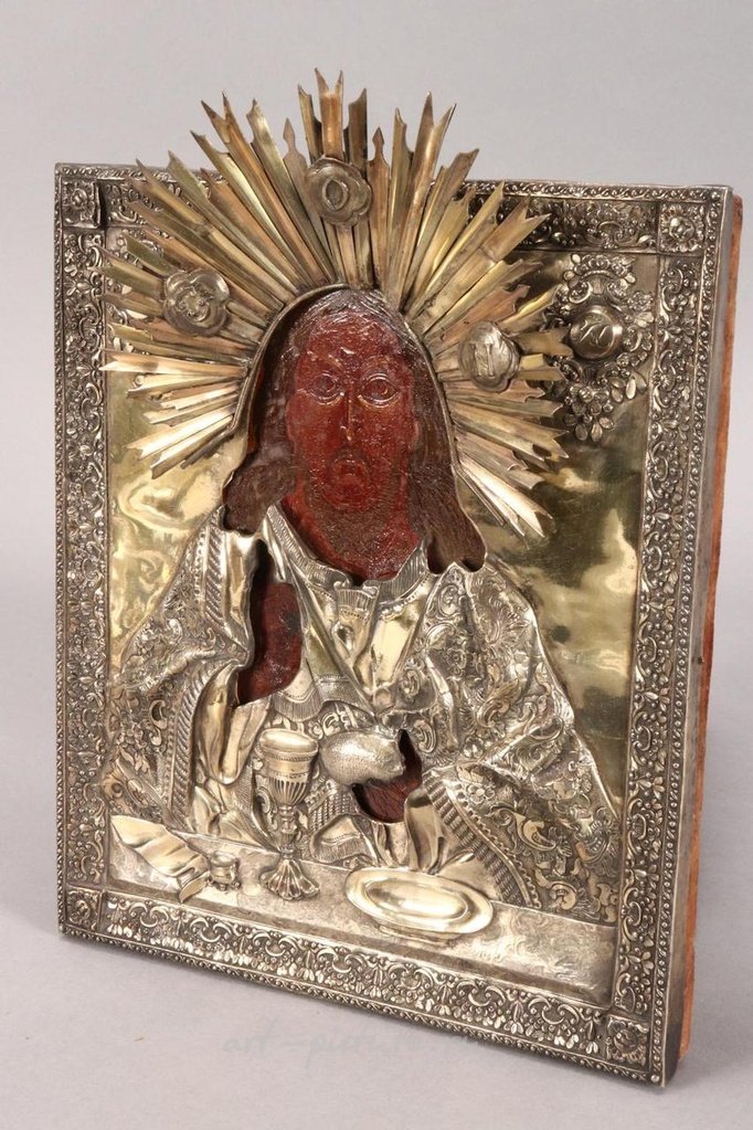 银制品,于1838年在圣彼得堡制造,由A.T.(Dmitry Ilyich Tverskoy,84)的鉴定员验证,制造商为F.R.(用西里尔字母),图案为带有光环的基督全能者坐在桌子后,手持面包,桌上有面包碟、杯子、盐和桌布,尺寸为35.5厘米x 27厘米。