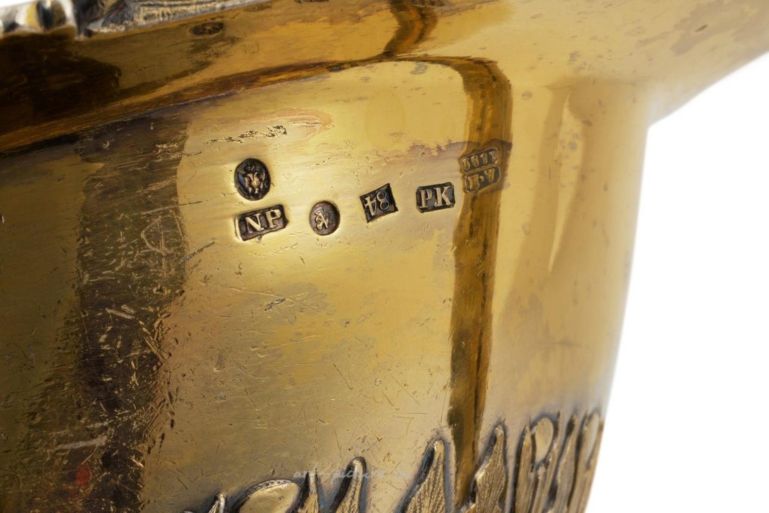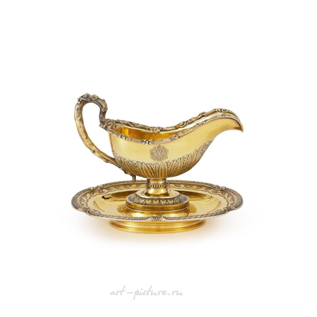 尼科尔斯和普林克,圣彼得堡,约1858年。酱汁碟上有一个螺旋底座,边缘装饰有间隔的奔跑的月桂树和刻有维特鲁威斯图案的花边,酱汁碟的边缘装饰有葡萄,而主体则刻有风格化的叶子和花朵。酱汁碟的两侧都刻有俄罗斯帝国的纹章。侧面和底座的主要部分都有完整的标记,还有帝国保证和库存编号。