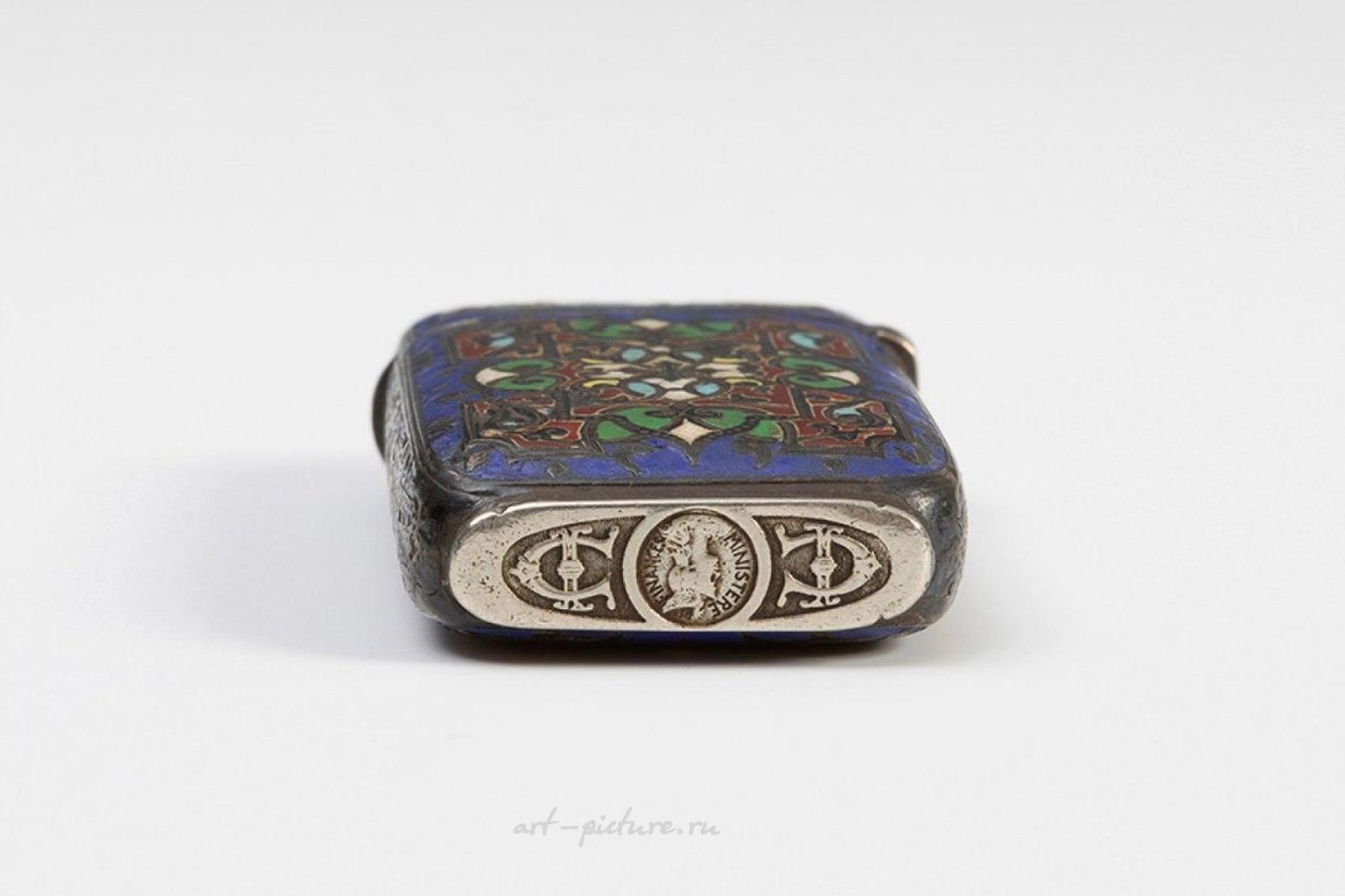 打火机。俄罗斯,约1900年。金属,银和克洛伊松搪瓷。底座上有铭文。尺寸:5 x 2.8厘米。俄罗斯打火机的表面完全装饰有几何图案,采用克洛伊松搪瓷技术进行彩绘,背景为深蓝色搪瓷。这种技术是在金属隔板限定的图案范围内涂抹搪瓷,金属隔板仍可见,围绕着设计。